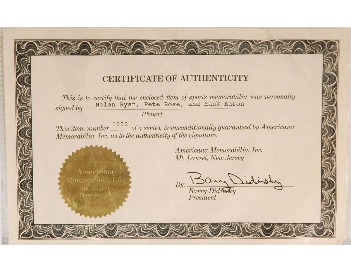 Baseball Memorabilia Signed by Nolan Ryan, Pete Rose and Hank Aaron
