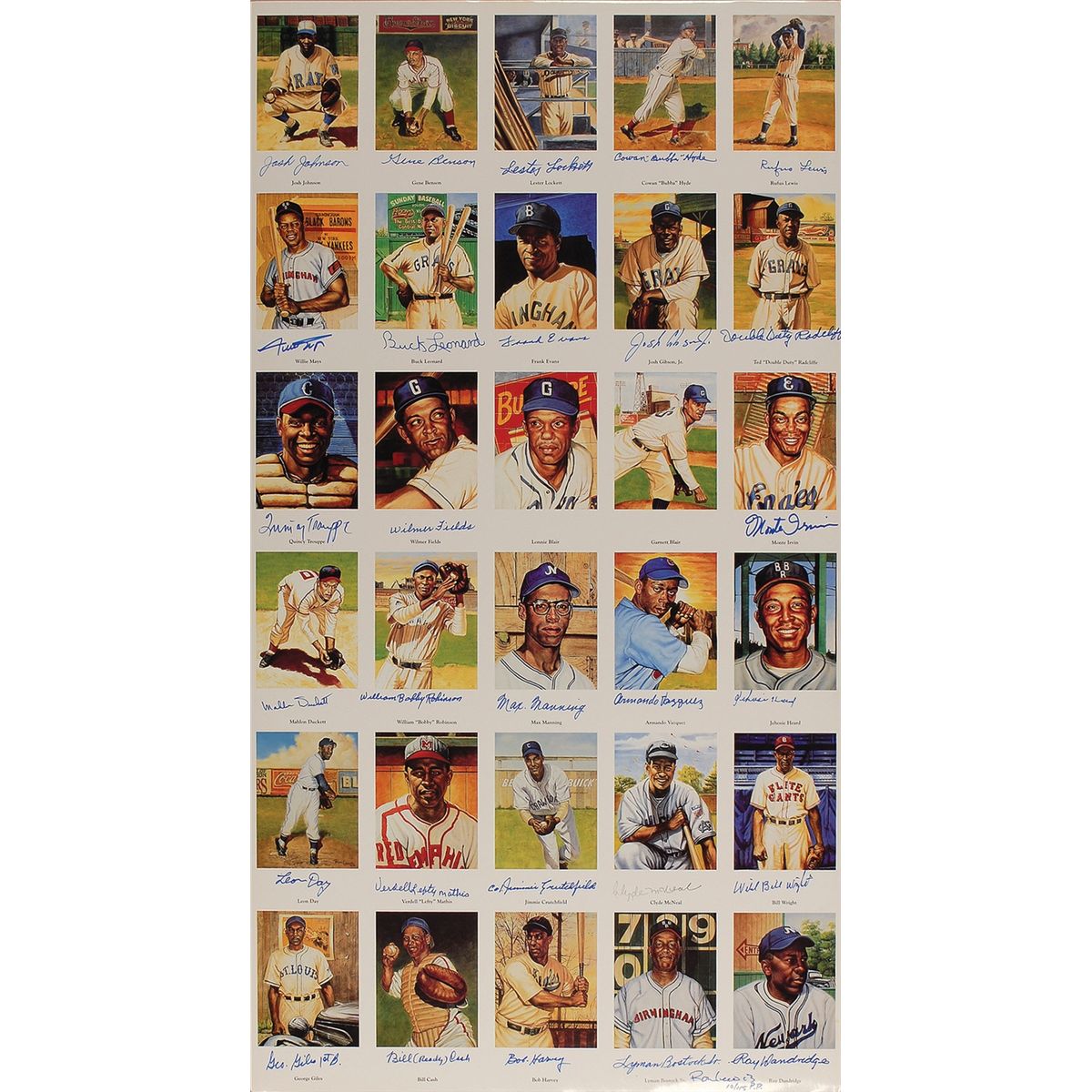 Limited edition uncut proof sheet, numbered “10/115 P.P.,” 17.5 x 31.75, of the 30 card Ron Lewis Negro League postcard set. Boldly signed in blue felt tip by 27 former players. Signers are: Willie Mays, Leon Day, Ray Dandridge, Judy Johnson, Buck Leonard, Monte Irwin, Gene Benson, Lester Lockett, Cowan ‘Bubba’ Hyde, Rufus Lewis, Ted ‘Double Duty’ Radcliffe, Josh Gibson, Jr., Frank Evans, Wilbur Fields, Quincy Trouppe, Mahlon Duckett, William ‘Bobby’ Robinson, Max Manning, Armando Vazquez, Jehosie Heard, ‘Wild’ Bill Wright, Jimmie Crutchfield, Verdell ‘Lefty’ Mathis, Lyman Bostock, Jr., Bob Harvey, Bill ‘Ready’ Cash, and George Giles. Also signed in blue felt tip by artist Ron Lewis. The Clyde McNeil signature is rubber-stamped, as was his custom after suffering a stroke. Small bends to corners and slight edge wear, otherwise fine condition.