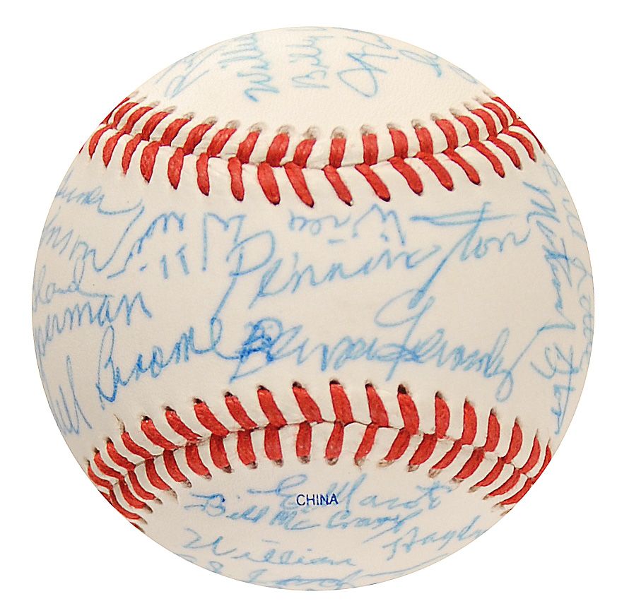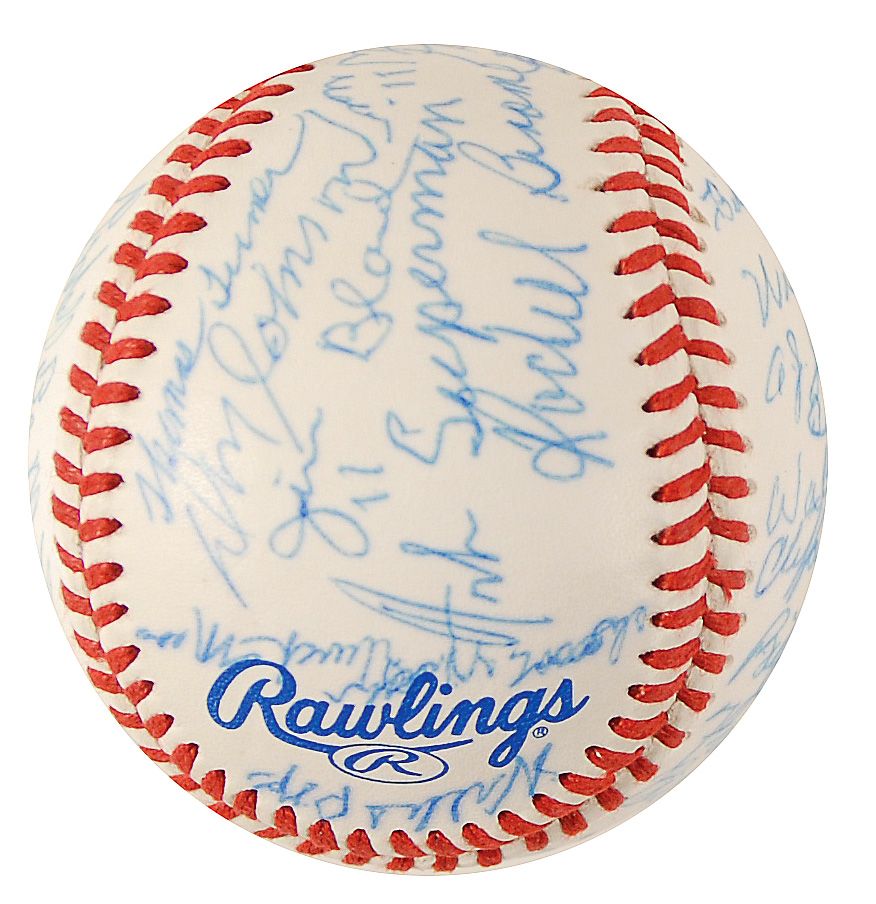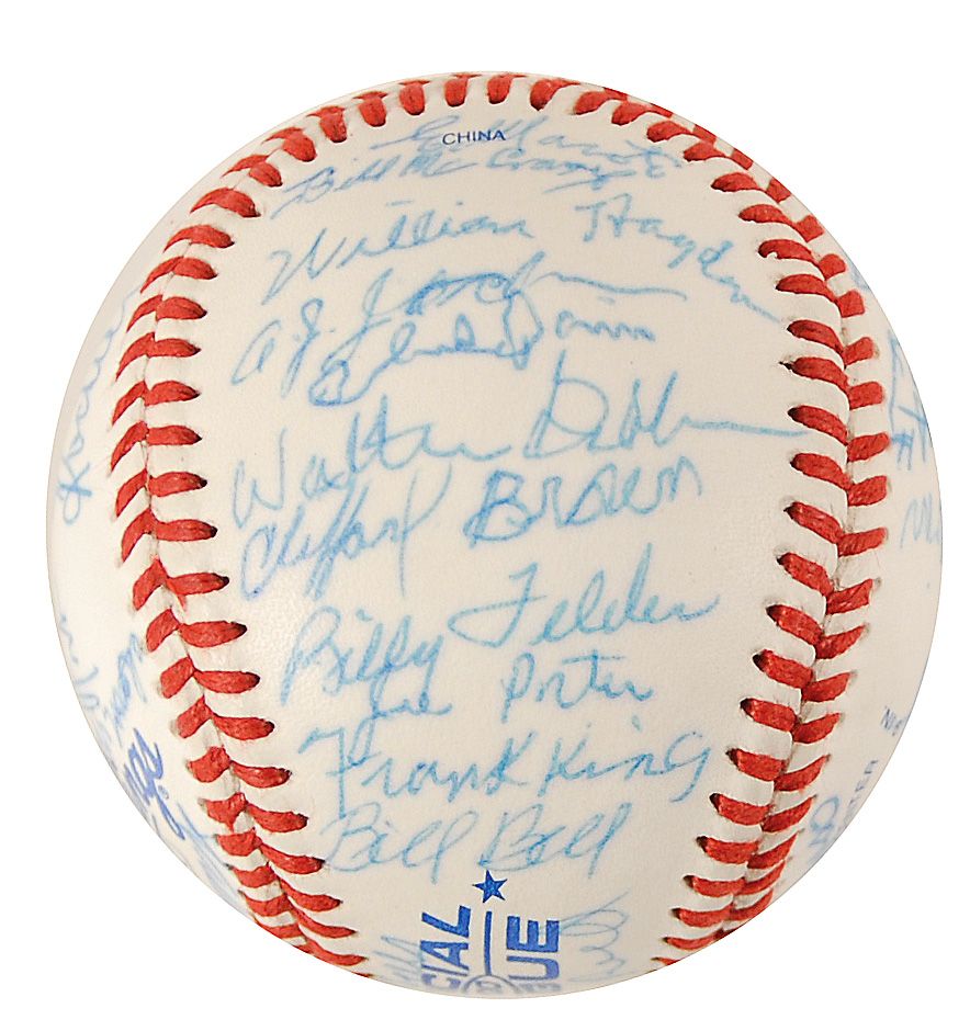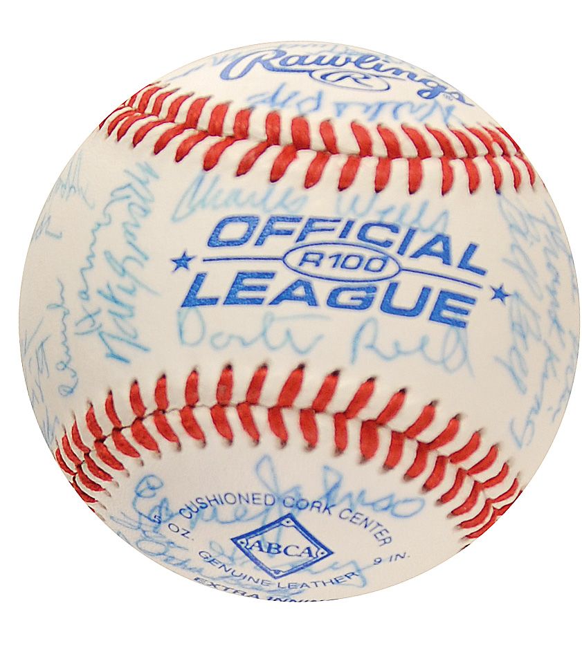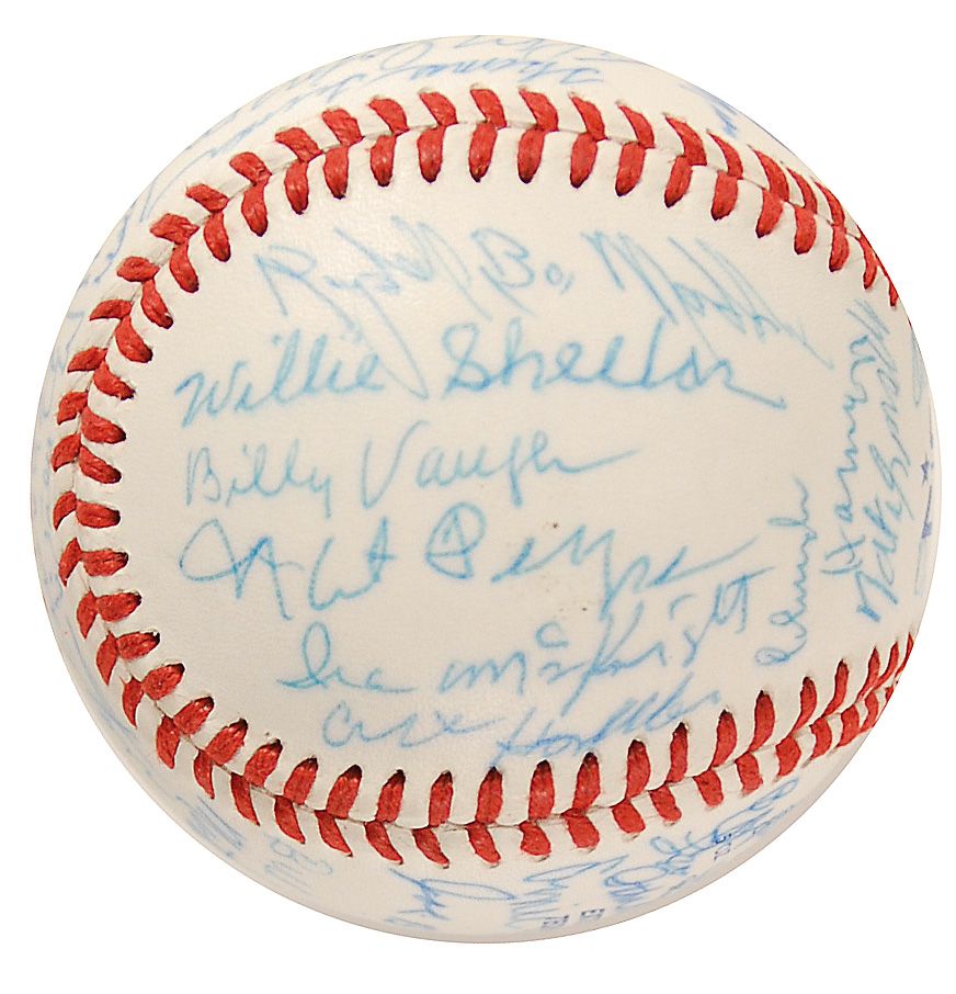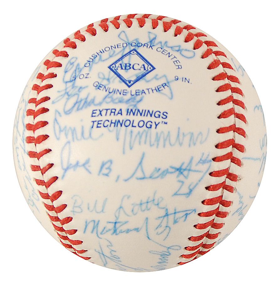 Rawlings Official League baseball signed in blue ballpoint by over 30 Negro League players, including Charles Wells, Willie Sheelor, Ira McKnight, Superman Pennington, Bill Little, Ernie Nimmons, Joe Scott, Bill Bell, Clifford Brown, and William Hayden. In fine condition, with some slight haloing to the signatures.