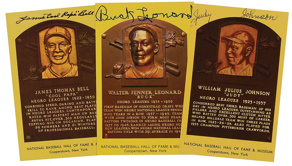 Three Gold Hall of Fame plaque cards individually signed in ballpoint or felt tip by James ‘Cool Papa’ Bell, Buck Leonard, and Judy Johnson. In fine condition.