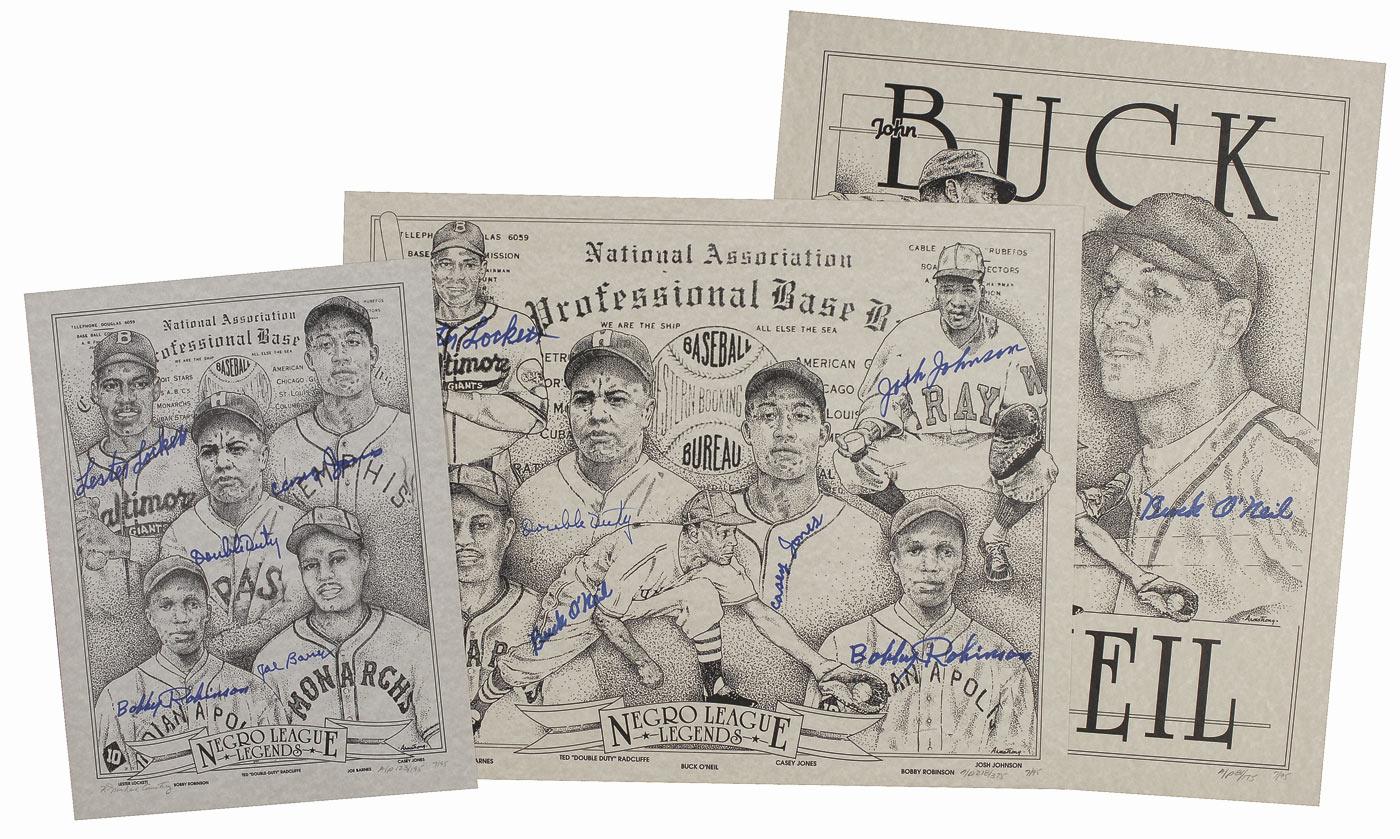 Three prints: limited edition 19.5 x 15.5 print, numbered #AP 218/375, signed in blue felt tip by Lester Lockett, Joe Barnes, Buck O’Neil, Double Duty [Radcliffe], Josh Johnson, Casey Jones, and Bobby Robinson; a limited edition 16 x 20 print of Buck O’Neil, #AP 81/175, signed in blue felt tip; and a limited edition 11 x 14 print, numbered #AP 167/195, signed in blue felt tip by Lester Lockett, Joe Barnes, Double Duty [Radcliffe], Casey Jones, and Bobby Robinson. All pieces are also signed in pencil by the artist, R. Michael Armstrong. In fine condition. Pre-certified Steve Grad/PSA/DNA and RRAuction COA.