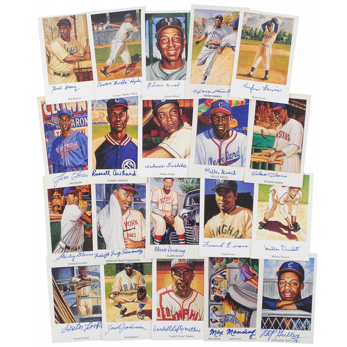 Collection of 20 color limited edition postcards featuring artwork by Ron Lewis, 3.5 x 5.5 and 5.5 x 3.5, each signed in ink by the player pictured, including: Lester Lockett, Wilmer Fields, Max Manning, Nap Gulley, Stanley Glenn, Rodolfo ‘Rudy’ Fernandez, Claro Duany, Frank Evans, Mahlon Duckett, Jim Cohen, Russell Awkard, Willie Grace, Wilmer Harris, Bob Harvey, Cowan ‘Bubba’ Hyde, Jehosie Heard, Henry Kimbro, Rufus Lewis, Josh Johnson, Jr., and Verdell ‘Lefty’ Mathis. In overall fine condition, with soiling to the edges of a few cards.