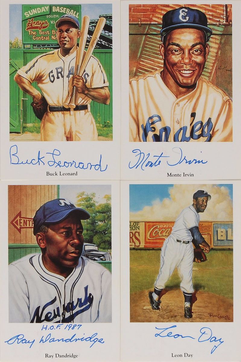 Collection of 25 limited edition Perez-Steele cards featuring artwork by Ron Lewis, 3.5 x 5.5, each signed in ink by the player pictured, including: Monte Irvin, Buck Leonard, Ray Dandridge, Leon Day, Bobby Robinson, Ted ‘Double Duty’ Radcliffe, Quincy Trouppe, Bill Wright, Clyde McNeal, Jimmie Crutchfield, Verdell ‘Lefty’ Mathis, Bob Harvey, Bill Cash, Mahlon Duckett, Max Manning, Jehosie Heard, Armando Vazquez, Wilmer Fields, Frank Evans, Josh Johnson, Gene Benson, Lester Lockett, Cowan ‘Bubba’ Hyde, Rufus Lewis, and Josh Gibson, Jr. In overall fine condition. Accompanied by three unsigned cards.