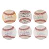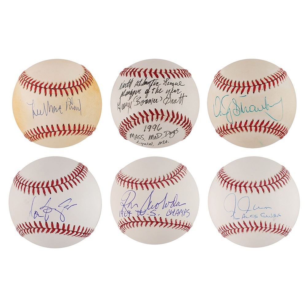 Six baseballs, including official Rawlings baseballs and a Wilson baseball, each signed by a noteworthy baseball player or executive. Signers are: Lee MacPhail, Don Baylor, Chris Chambliss ("76 ALCS GW HR"), Darryl Strawberry, Ron Swoboda ("1969 W. S. Champs"), and George 'Boomer' Scott ("North Atlantic League Manager of the Year, 1996 Mass. Mad Dogs, Lynn, MA"). In overall fine condition, with toning to the MacPhail baseball. Accompanied by a certificate of authenticity from JSA for Baylor.