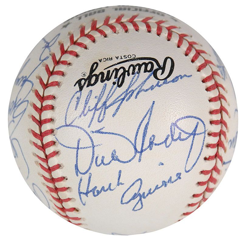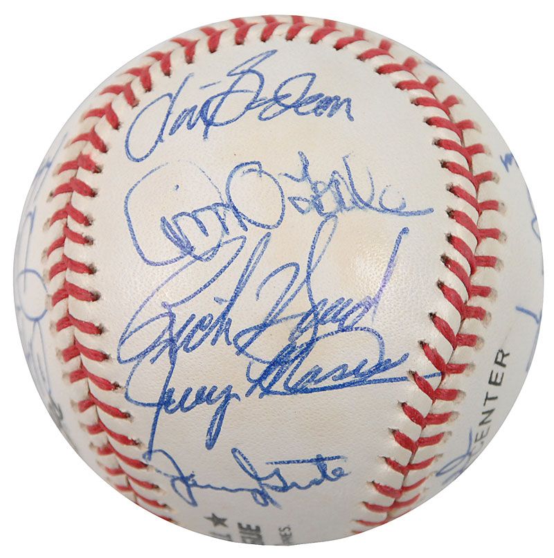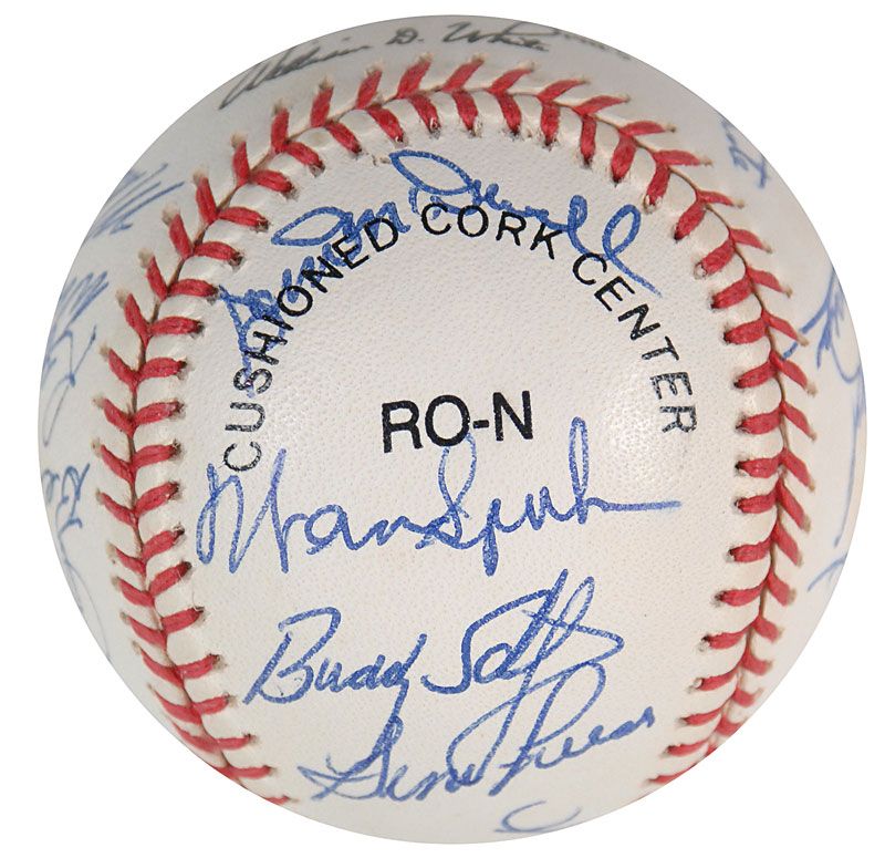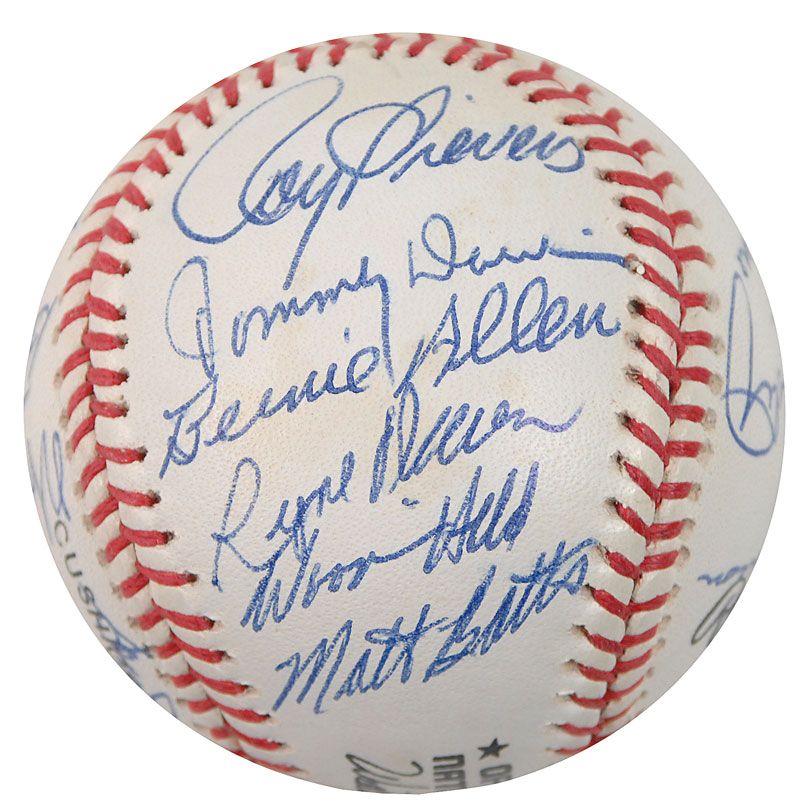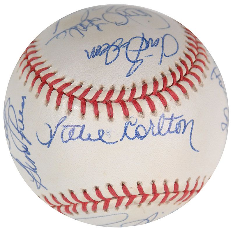 Official Rawlings National League baseball signed in blue ballpoint on the sweet spot and side panels by 19 former baseball players. Signers include: Steve Carlton, Warren Spahn, Jim O’Toole, Roy Sievers, Hank Aguirre, Dick Radatz, Tommy Davis, Jerry Grote, Cliff Johnson, Bernie Allen, Woodie Held, Matt Batts, Ryne Duren, and Buddy Schultz. In fine condition.