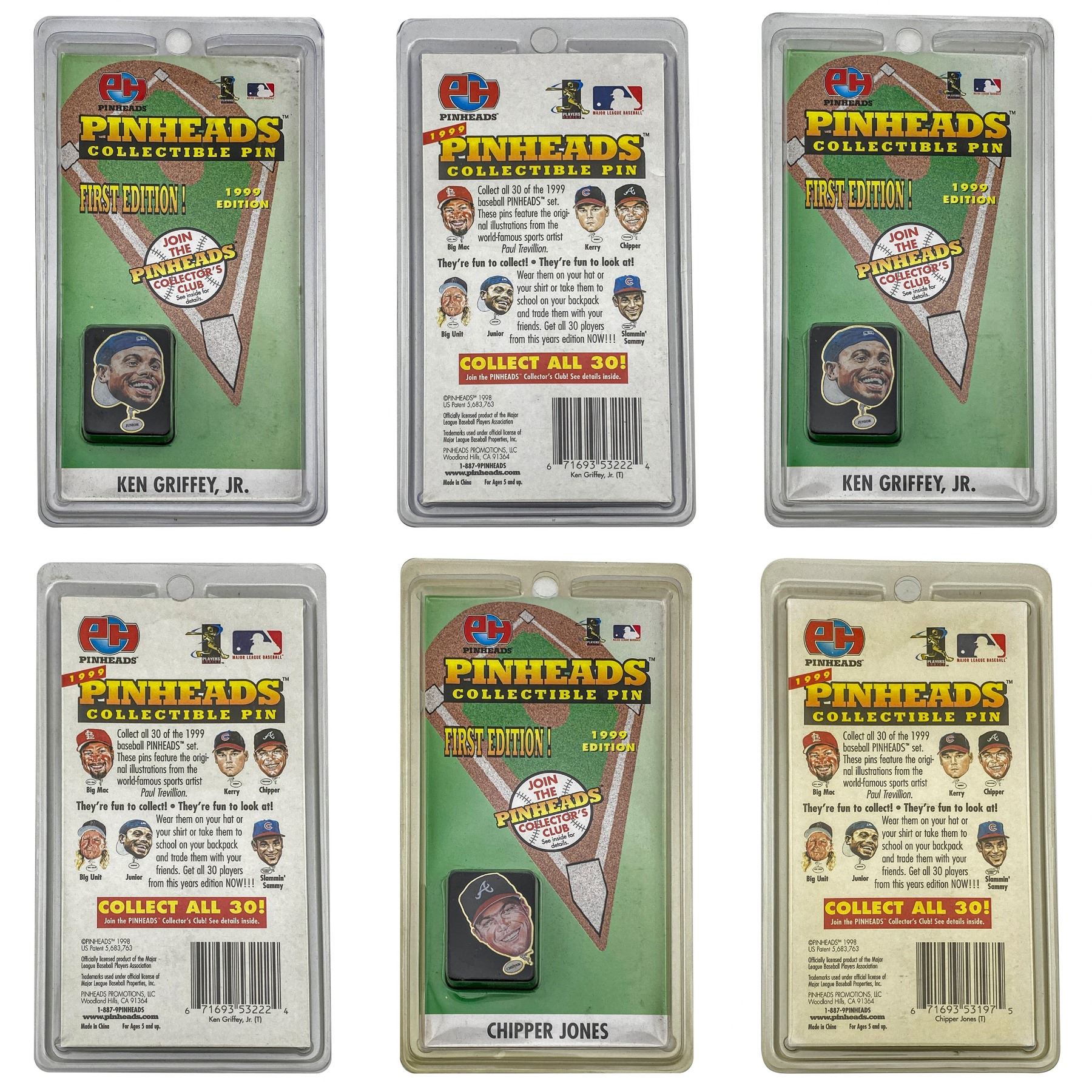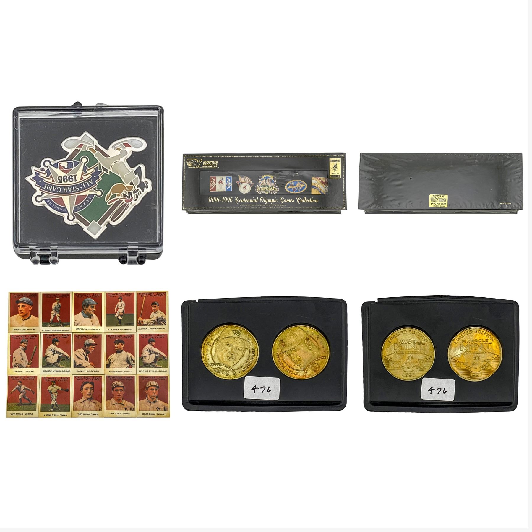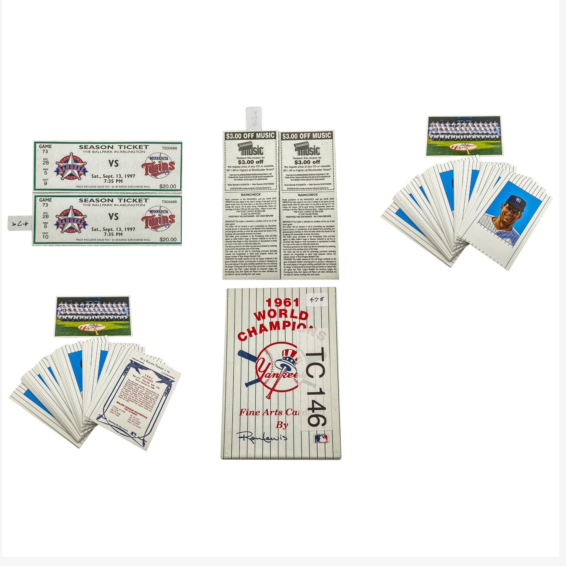 Baseball Pins Box [19 pins], 1997 Pinnacle Mint 3 Coins [Tim Salmon, Brian Jordan, Ryan Klesko], 1993 Cracker Jack Mini Cards [24 cards], 1961 World Champions Card Set by Ron Lewis [48 cards], 1997 Game 73 Season Ticket [2 Tickets], Topps Tin Baseball Sign & 2021 Beckett Vintage Almanac/Other Books [6 books]