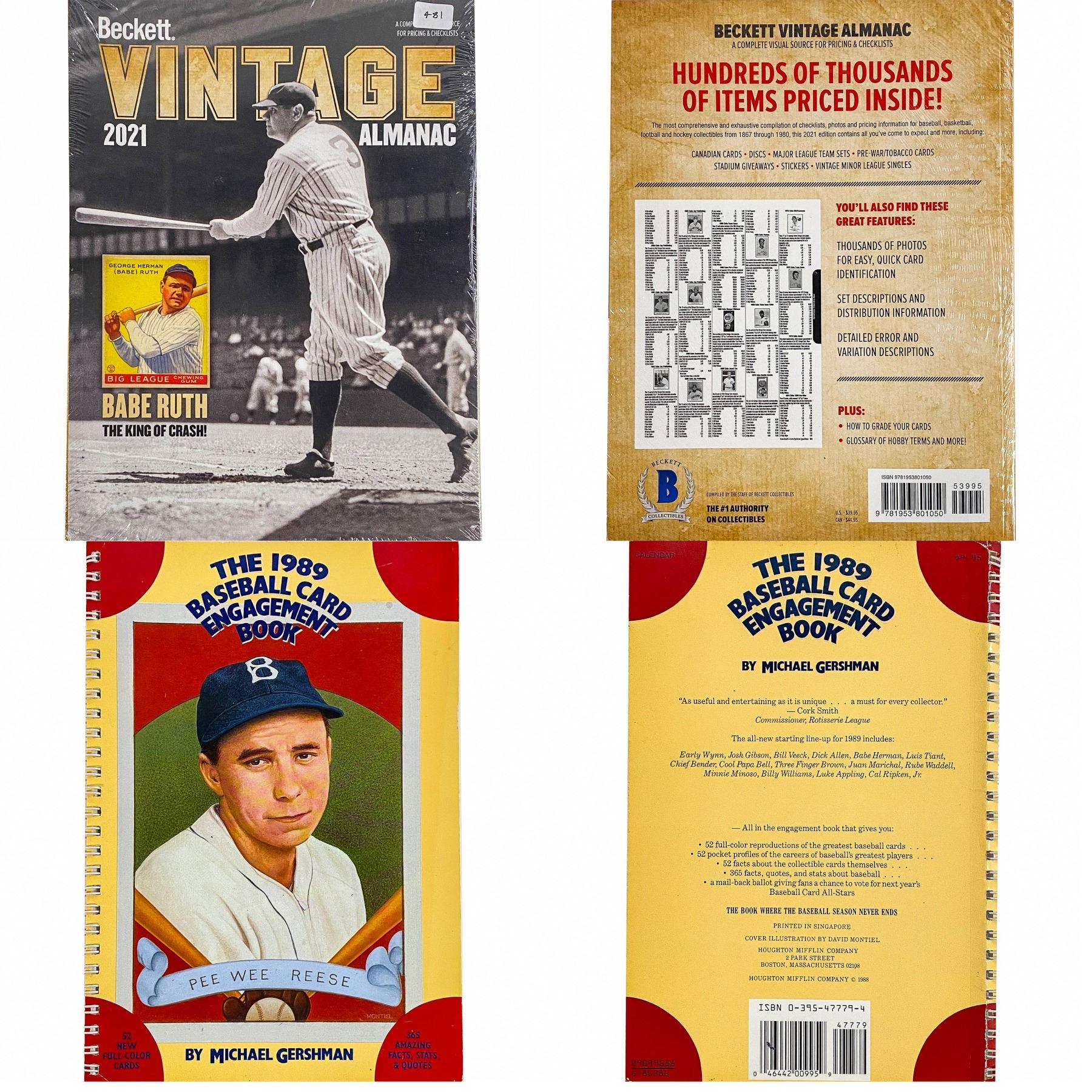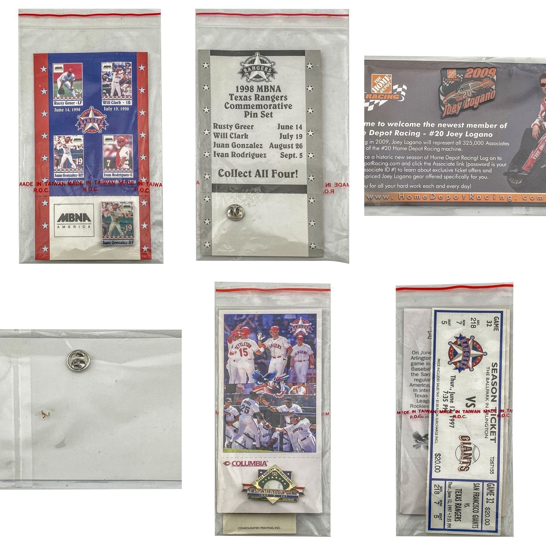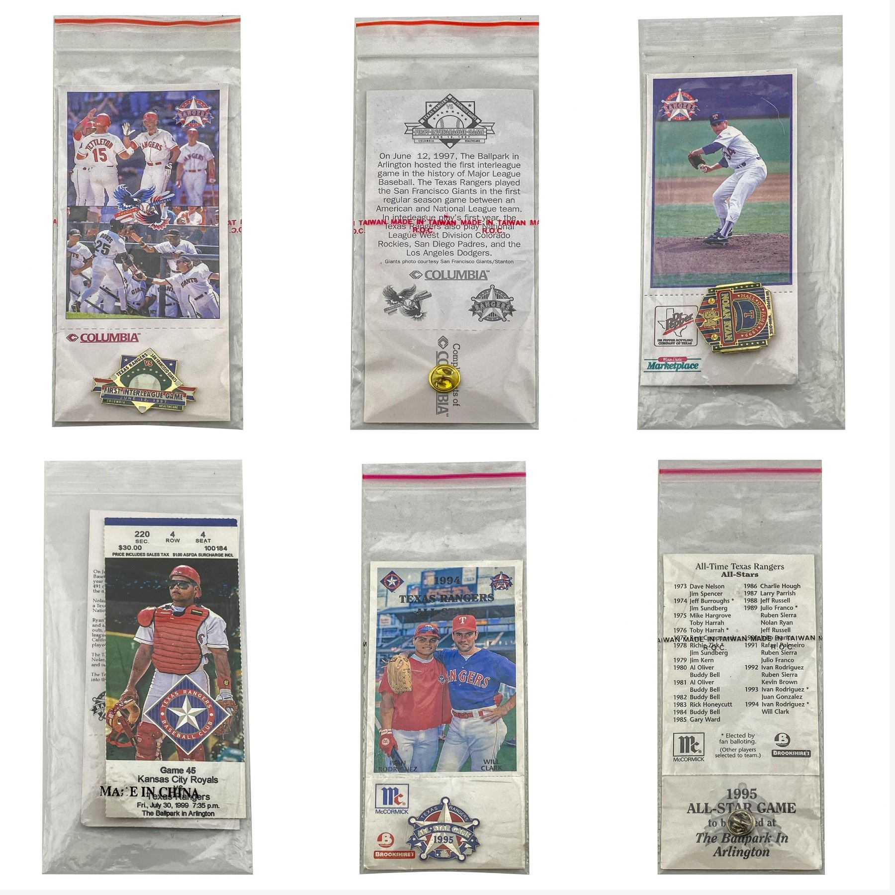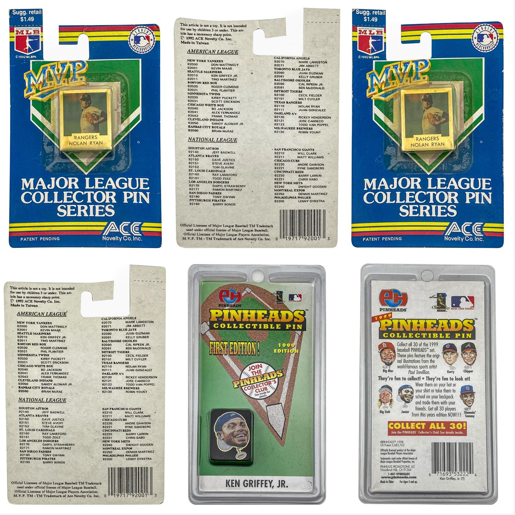 Baseball Pins Box [19 pins], 1997 Pinnacle Mint 3 Coins [Tim Salmon, Brian Jordan, Ryan Klesko], 1993 Cracker Jack Mini Cards [24 cards], 1961 World Champions Card Set by Ron Lewis [48 cards], 1997 Game 73 Season Ticket [2 Tickets], Topps Tin Baseball Sign & 2021 Beckett Vintage Almanac/Other Books [6 books]