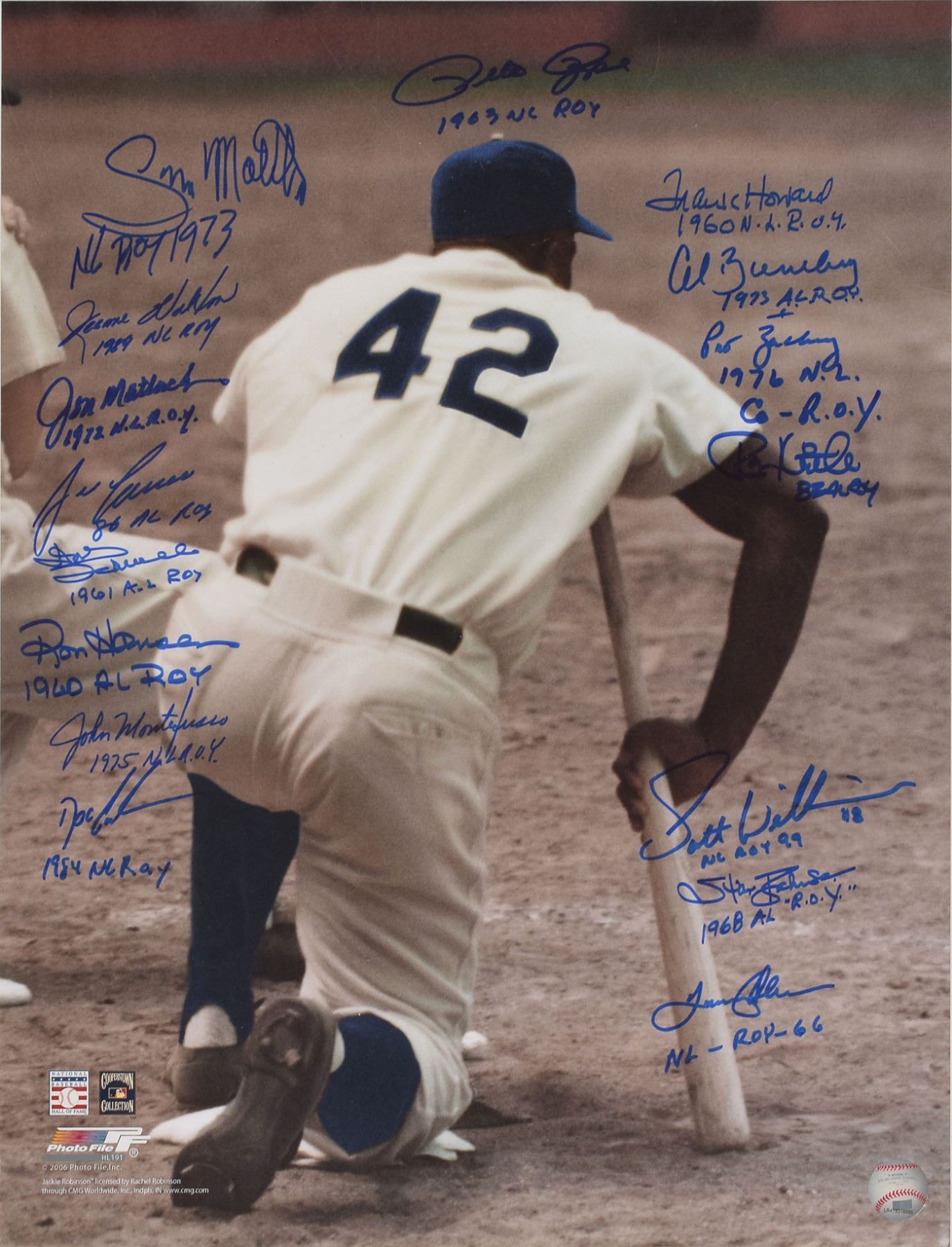 Color satin-finish 16 x 20 photo of Jackie Robinson kneeling with a bat in hand, signed in blue felt tip by 16 winners of the Rookie of the Year award, all of whom add the year and league. Signers are: Pete Rose, Gary Matthews, Jerome Walton, Jon Matlack, Jose Canseco, Don Schwall, Ron Hansen, John Montefusco, Doc Gooden, Frank Howard, Al Bumbry, Pat Zachry, Ron Kittle, Scott Williamson, Stan Bahnsen, and Tommy Helms. Rolled and in fine condition.