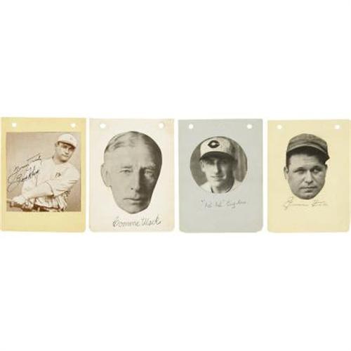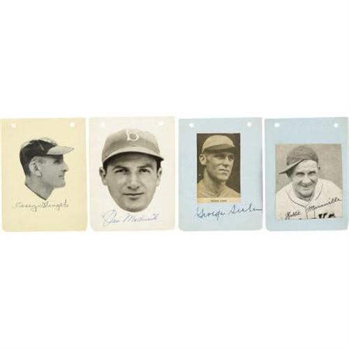 <B>1930's Baseball Signed Autograph Lot of 123 with Ruth, Foxx, Cuyler.</B></I> Fantastic collection of prewar autographs from our National Pastime offers no shortage of the game's all-time greats, offering an intriguing look into one young man's hobby many decades ago. Most autographs are penned on colored album pages, often with an image of the player carefully trimmed from newspapers and magazines and pasted beside the signature. Quite a few autographs are placed directly on the image, and will be italicized if it is a signed image in the list to follow. Signature quality is a fantastic 9/10 and better throughout, with almost no exceptions. The brightest star, of course, is <I>Babe Ruth,</B></I> whose 1930's-era autograph appears upon an image of him in Red Sox uniform. The piece is encapsulated by PSA/DNA in a NM-MT 8 holder. Also featured: <I>Musial,</B></I> <I>Hartnett,</B></I> <I>Maranville,</B></I> <I>Schoendienst,</B></I> <I>Grimes,</B></I> Gomez, <I>Ruffing,</B></I> Gehringer, <I>Terry,</B></I> Rizzuto, Medwick, Stengel, Mack, <I>Manush,</B></I> Herman, Hubbell, Lyons, Lombardi, <I>Southworth,</B></I> Sisler, Greenberg, <I>Wheat,</B></I> Rick Ferrell, <I>Grove,</B></I> Lloyd Waner, <I>McCarthy,</B></I> Foxx, Bottomley, <I>Mize</B></I> (3), <I>Rixey,</B></I> Cuyler, Lopez. One of the finest treasure troves of vintage baseball autographs we've seen in some time, this collection affords one savvy hobbyist the opportunity to take his collection to the next level with a single bid. <I>LOA from PSA/DNA.</B></I><BR><BR><b>Shipping:</b> Flat Material, Small (<a target="_blank" href="http://www.heritageauctions.com/common/shipping.php">view shipping information</a>)