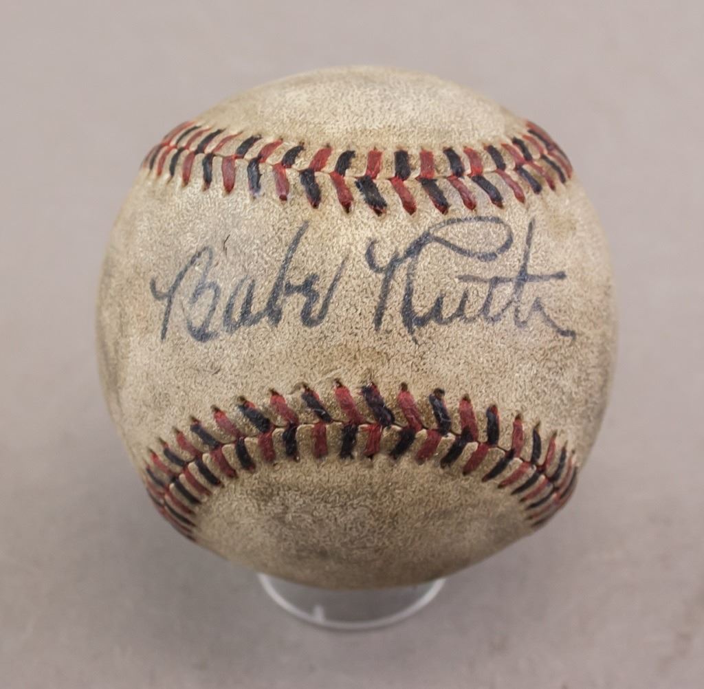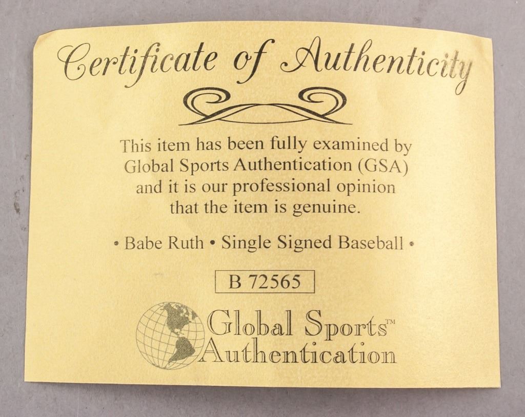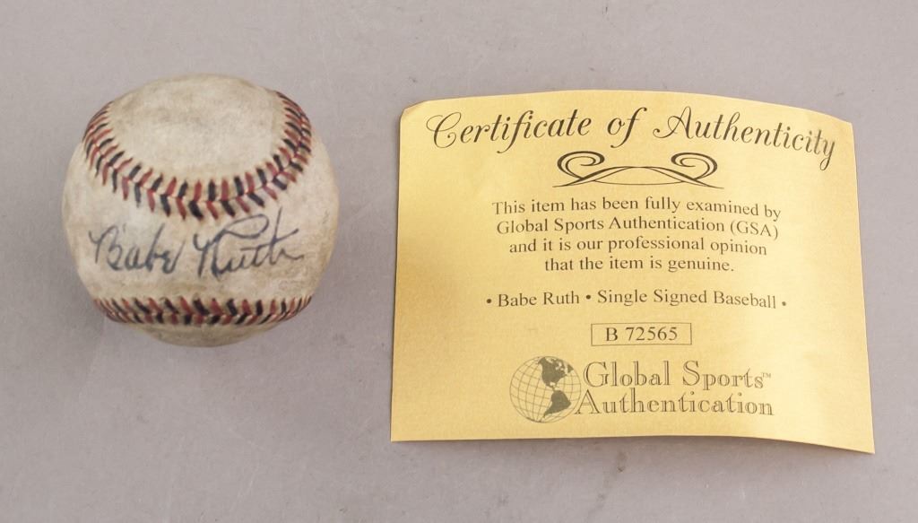 Signed baseball. With signature reading "Babe Ruth". Accompanied with COA, with number B 72565. Diameter: 13 cm, 182 grams.