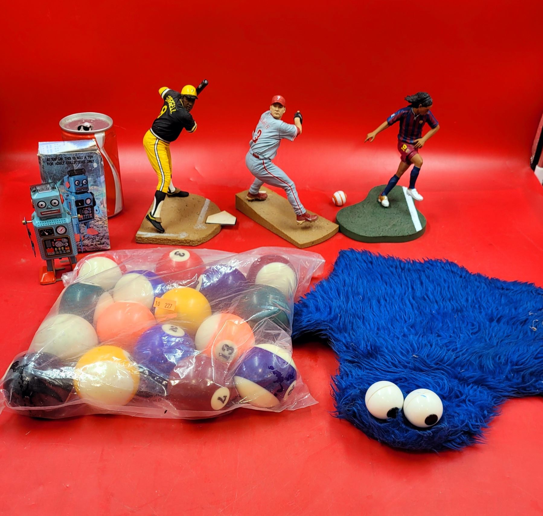 Baseball/Soccer Figurines, Pool Balls, Cookie Monster Mat & Collector's Robot