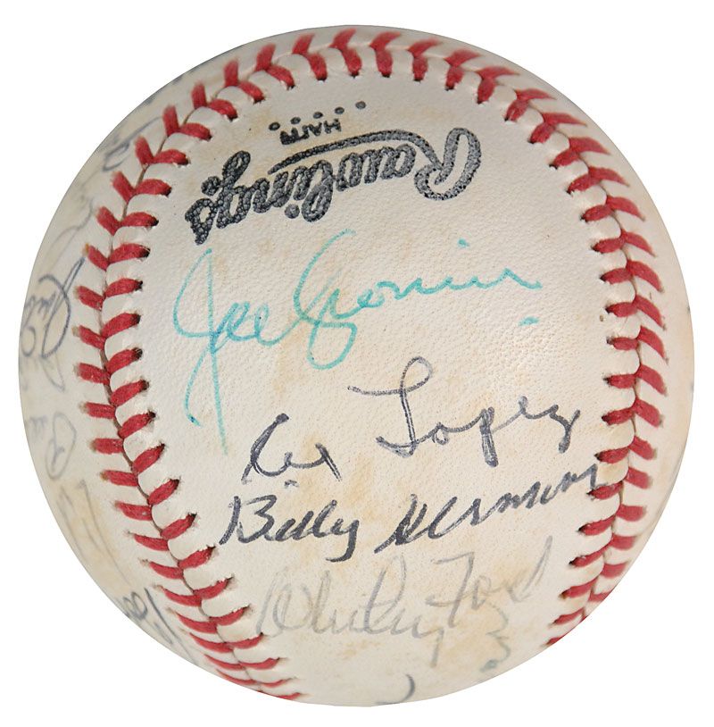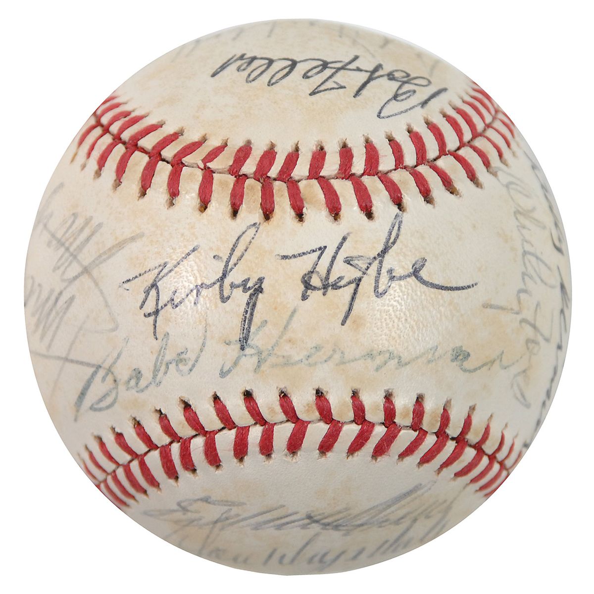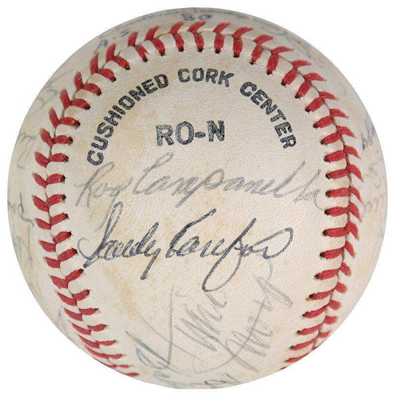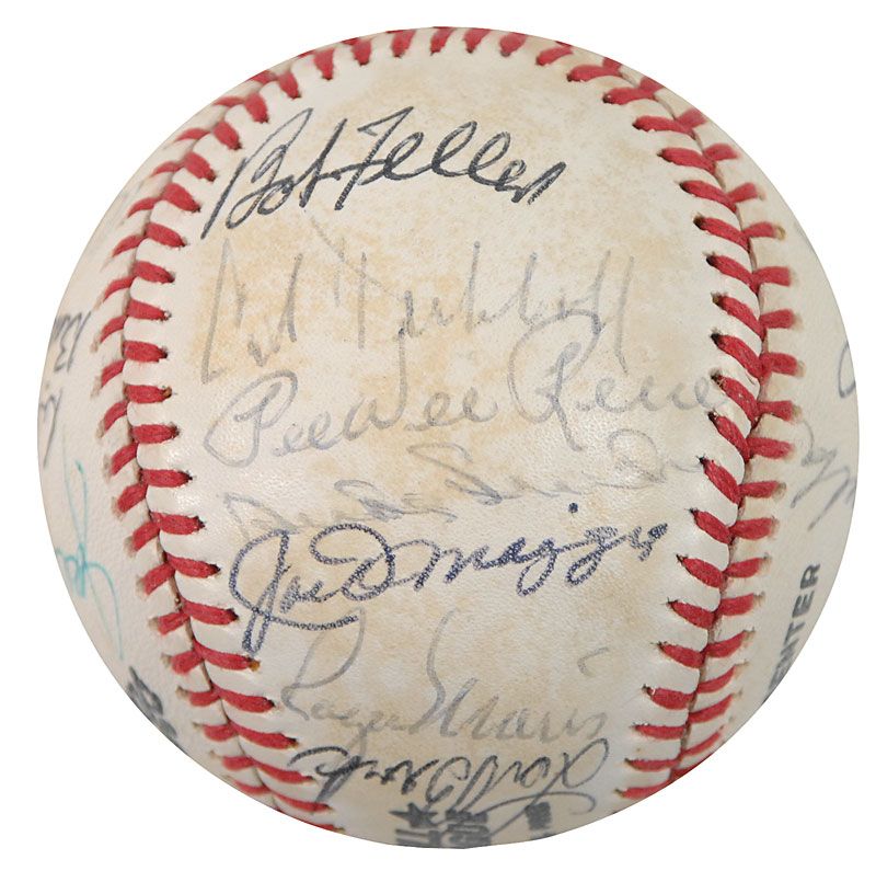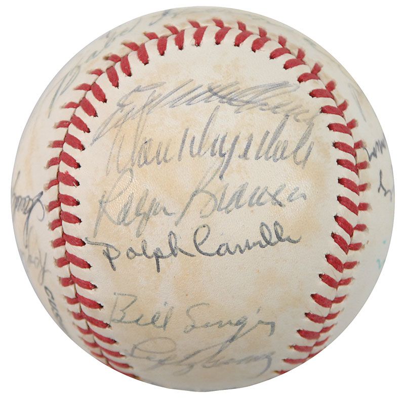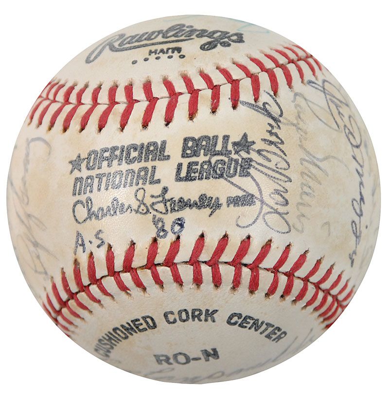 Official Rawlings National League baseball signed in ballpoint on the sweet spot and side panels by 21 stars and Hall of Famers. Signers are: Roger Maris, Joe DiMaggio, Sandy Koufax, Willie Mays, Eddie Mathews, Don Drysdale, Joe Cronin, Duke Snider, Pee Wee Reese, Al Lopez, Whitey Ford, Lefty Gomez, Lou Brock, Billy Herman, Carl Hubbell, Bob Feller, Babe Herman, Ralph Branca, Dolph Camilli, Bill Singer, and Kirby Higby. Moderate scattered toning and a tiny ballpoint notation to league stamp, otherwise fine condition. Baseball also bears a secretarial signature of Roy Campanella, his wife signing on his behalf. Consignor notes that the ball was signed at the 1980 All-Star game.