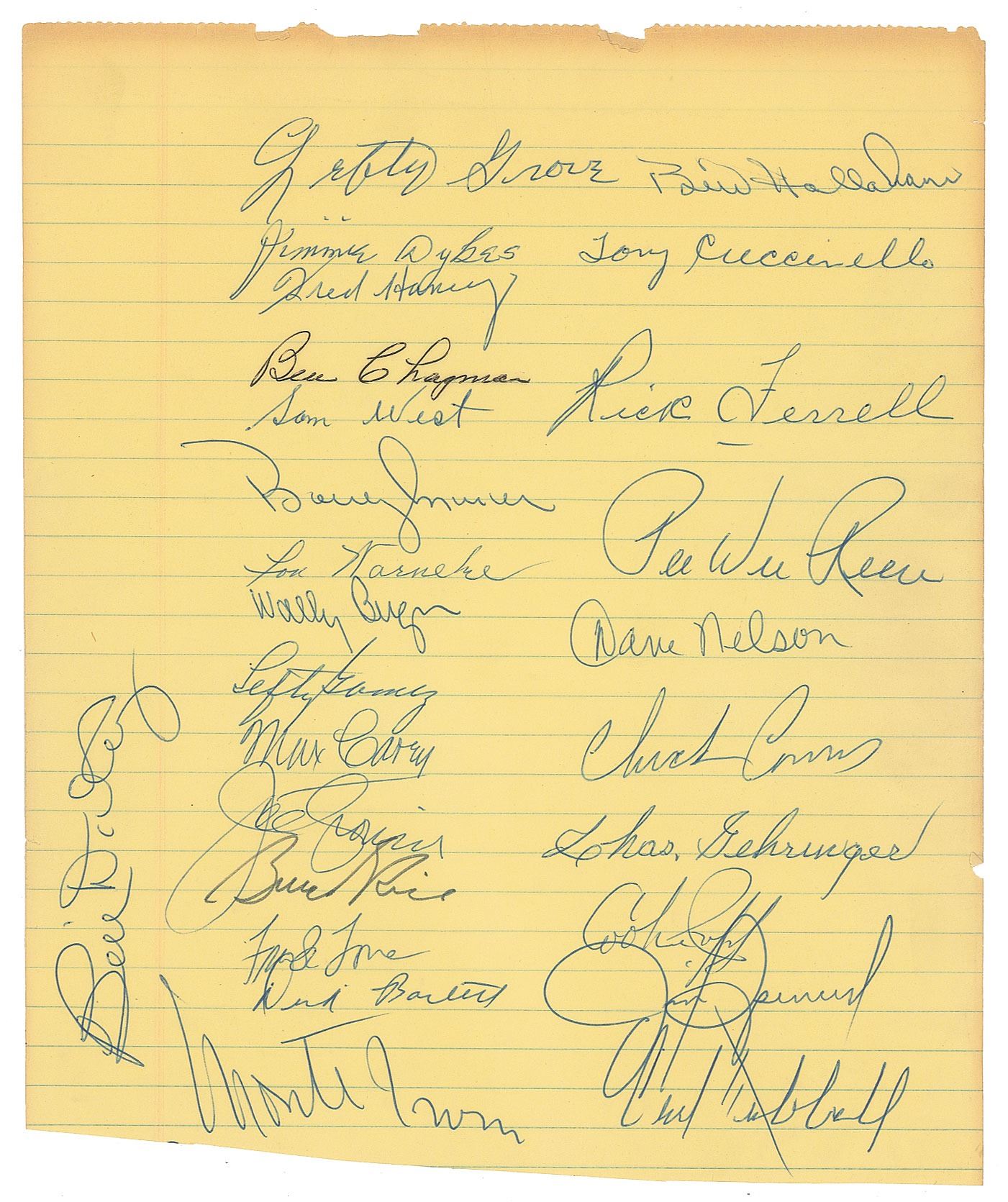Ballpoint signatures of 26 old-time baseball stars and Hall of Famers on a yellow 8.5 x 10 lined sheet, including: Lefty Grove, Lefty Gomez, Max Carey, Joe Cronin, Monte Irvin, Rick Ferrell, Pee Wee Reese, Charlie Gehringer, Carl Hubbell, Jimmie Dykes, Fred Haney, Ben Chapman Sam West, Bobby Murcer, Lon Warneke, Wally Berger, Bill Hallahan, Tony Cuccinello, Dave Nelson, and others. In very good to fine condition, with some light creasing, tiny chips to edges, and a trimmed bottom edge.