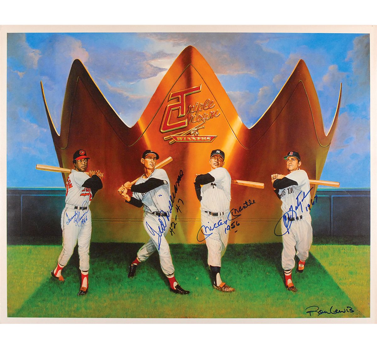 Impressive color 25 x 20 print of Ron Lewis’s work honoring four legendary Triple Crown winners, signed in blue felt tip by Frank Robinson, Ted Williams, Carl Yastrzemski, and Mickey Mantle, each adding their Triple Crown year. Also signed in the lower right by the artist. In fine condition, with unobtrusive scattered surface creases and wrinkles, and subtle edge toning. A gorgeous example featuring bold, prominent signatures.