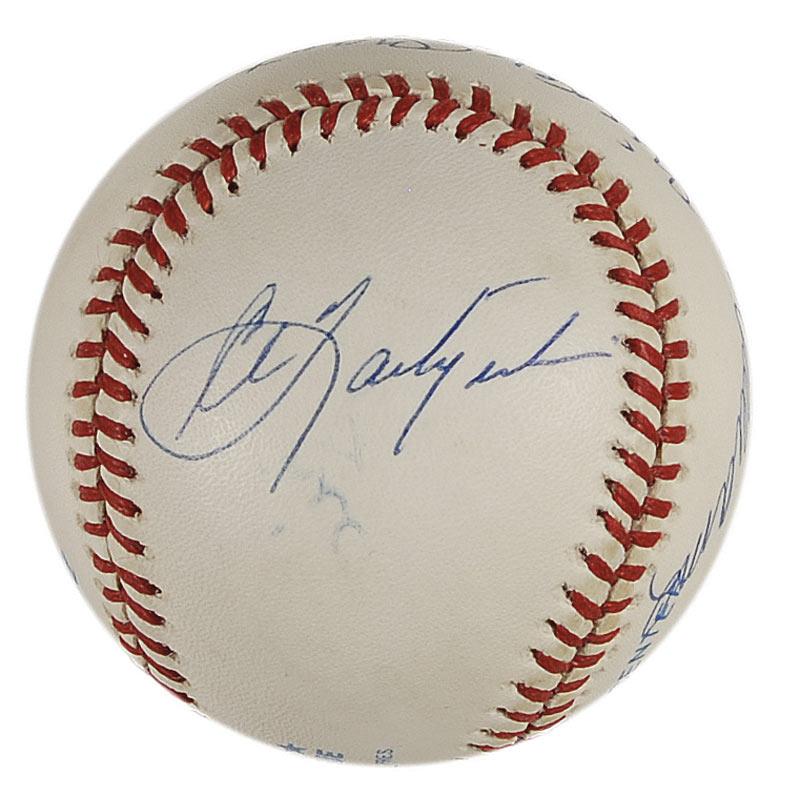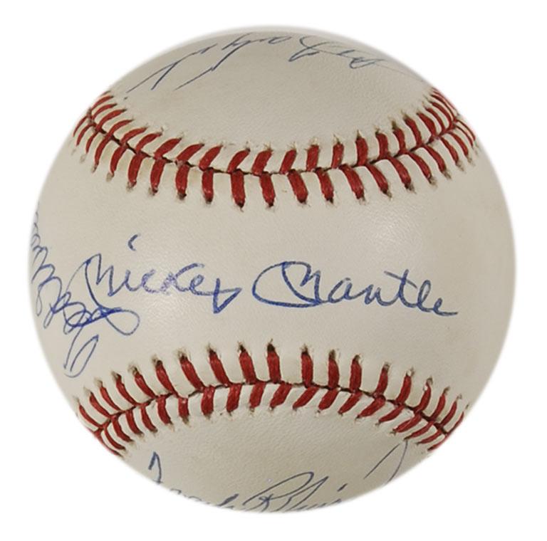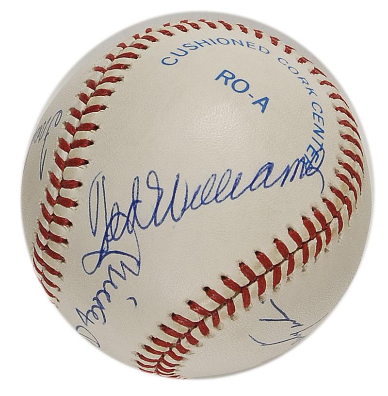 Official Rawlings American League baseball signed in blue ballpoint by the last four Triple Crown winners: Mickey Mantle (ss), Ted Williams, Frank Robinson, and Carl Yastrzemski. In fine condition, with some scattered mild toning, a bit affecting Robinson’s signature, William’s and Mantle’s signatures slightly overlapping, and a few stray ink marks under Yaz’s signature.
