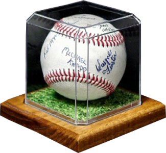 This product is injection molded, using water-clear polystyrene. The result is a very clear, hard (rigid) plastic container, that displays the contents well with a wood base as shown. Perfect For your collectible baseball. Comes with Grass insert for black base. Overall Size - 3.125" x 3.125" x 3". A great way to display your baseball. (baseball not included)