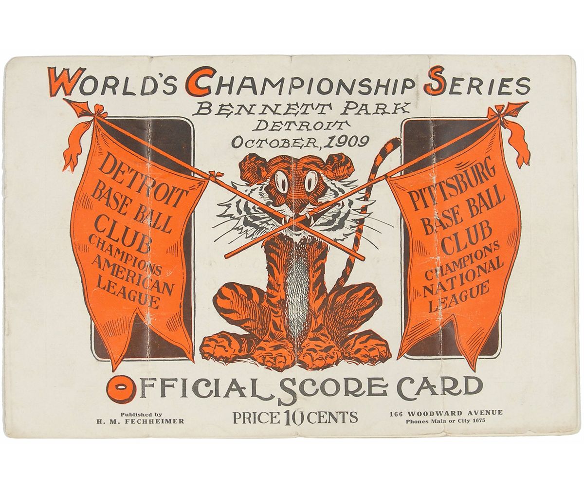 Exceptionally rare program for the 1909 World Series, 10 x 6.5, featuring a cartoonish tiger on the front cover holding pennants for the American League Champion Detroit Tigers and National League Champion Pittsburgh Pirates. The program is scored in pencil for the third game of the series on October 11, 1909, in which the Pirates beat the Tigers 8–6, led by a three-hit performance from Honus Wagner. In very good condition, with three significant vertical folds, some slight chipping to edges, and pencil marks inside front and back covers.