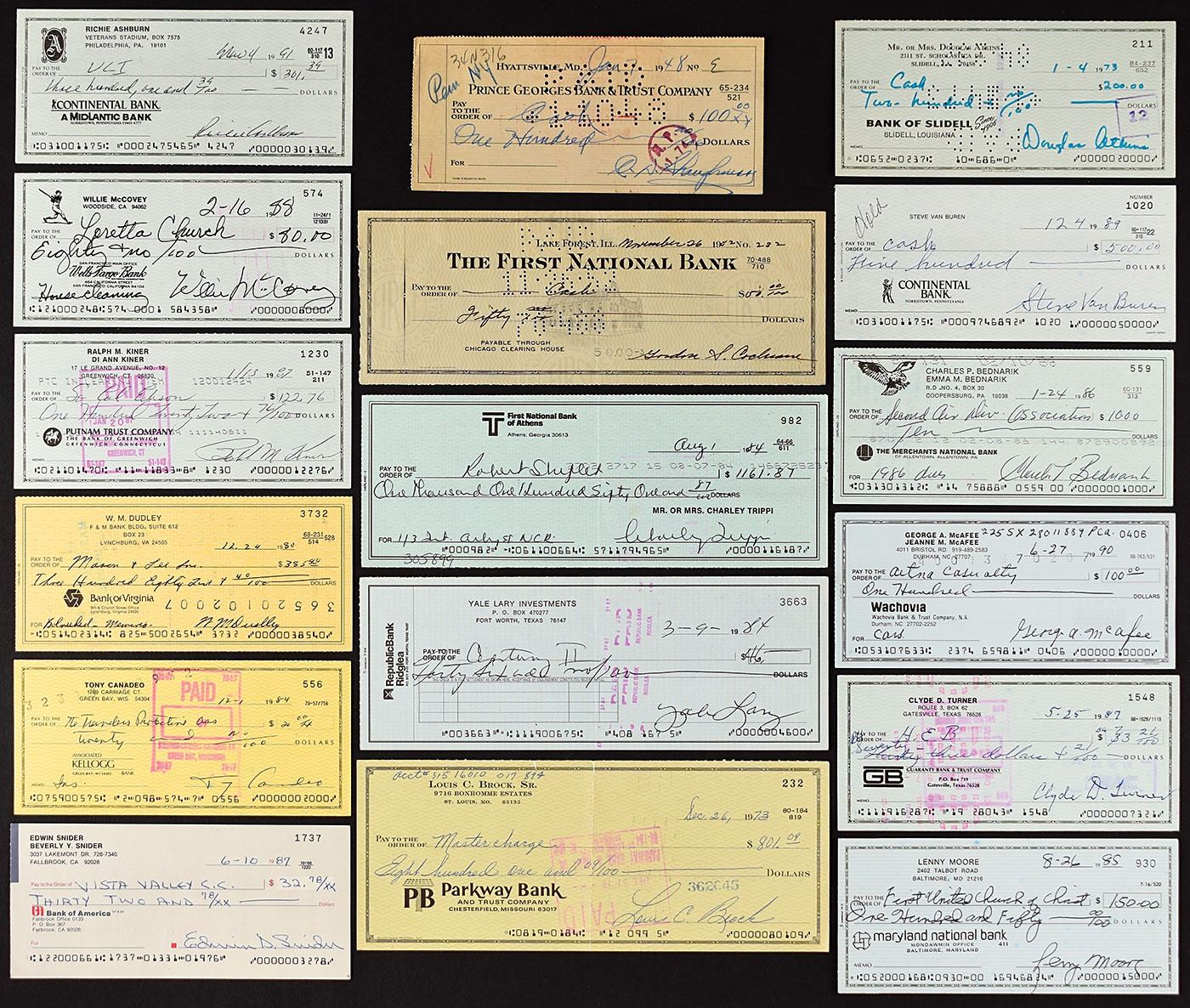 Group lot of 17 checks signed by a notable baseball or football hero, ranging in size from 6 x 2.75 to 8.25 x 3.25, with the majority filled out by the player or coach, including: Richie Ashburn, Doug Atkins, Chuck Bednarik, Lou Brock, Tony Canadeo, Mickey Cochrane (also endorsed on reverse), Bill Dudley, Ralph Kiner, Yale Lary, George McAfee, Willie McCovey, Lenny Moore, Clark Shaughnessy, Duke Snider, Charley Trippi, Clyde Turner, and Steve Van Buren (also endorsed on reverse). In overall fine condition.