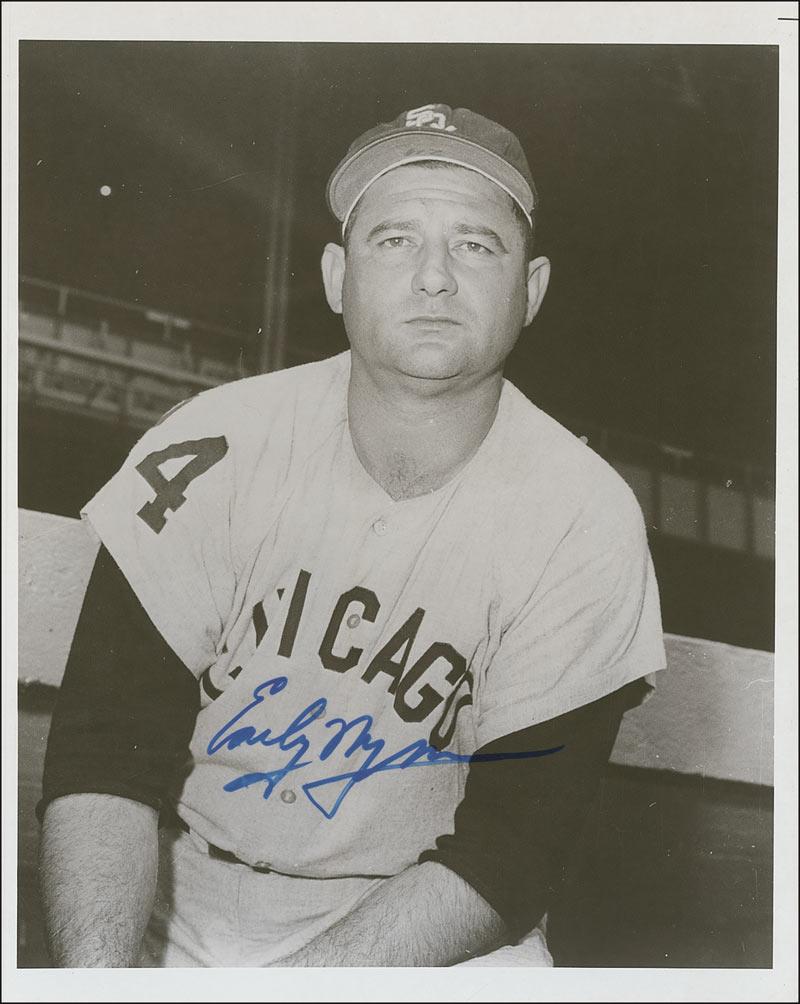 Three glossy 8 x 10 photos, each signed in ballpoint or felt tip by the respective Hall of Famer pictured. Signers are: Don Drysdale (ins), Early Wynn, and Robin Roberts. In fine condition, with scattered light bends and creases to all three, and mild overall skipping to Drysdale’s signature and inscription.