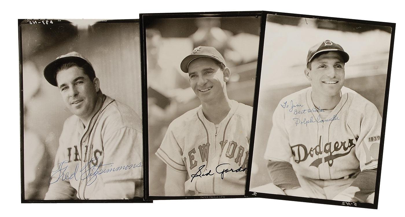 Three semi-glossy heavyweight photos, 5 x 7, all made from the original negatives, each signed in ballpoint or felt tip by the player pictured. Signers are: Dolph Camilli (ins), Fred Fitzsimmons, and Sid Gordon. In fine overall condition, with a few light creases and edge silvering.