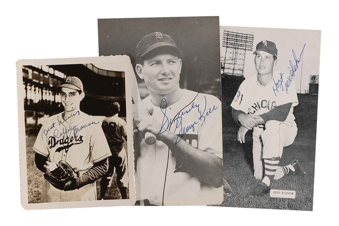 Three signed glossy and cardstock photos, ranging in size from 3.5 x 4.25 up to 3.5 x 5.5, each signed in ink or ballpoint by the respective player pictured. Signers are: Ralph Branca, George Kell, and Hoyt Wilhelm. In fine condition, with creasing and silvering to Branca’s photo.
