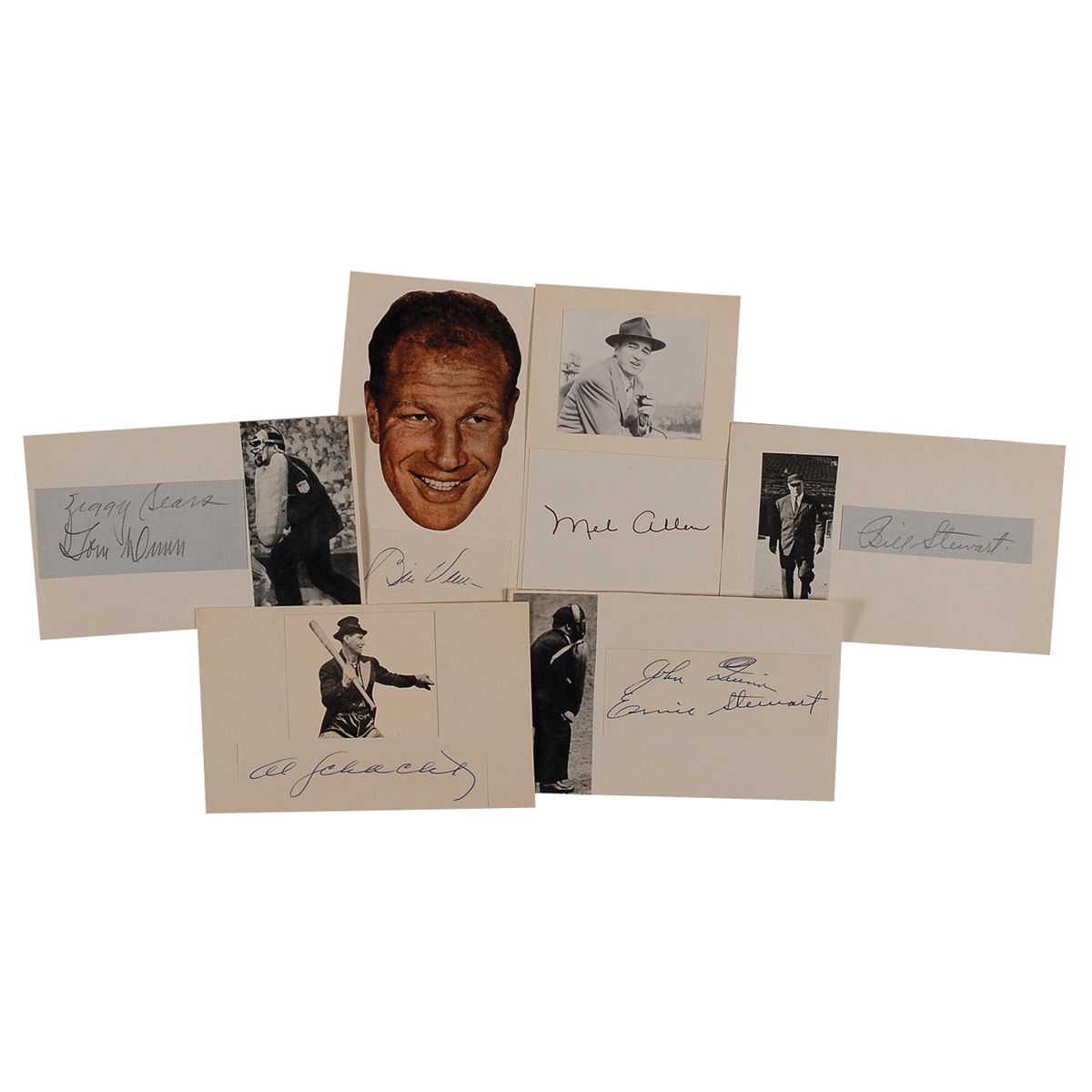 Eight ink and pencil signatures of baseball notables on off-white 6 x 3.75 cards, each with a clipped photo of the notable. Signers are: Bill Veeck, Bill Stewart, Mel Allen, Ernie Stewart, Al Schacht, Tom Dunn, and two others. In fine condition.