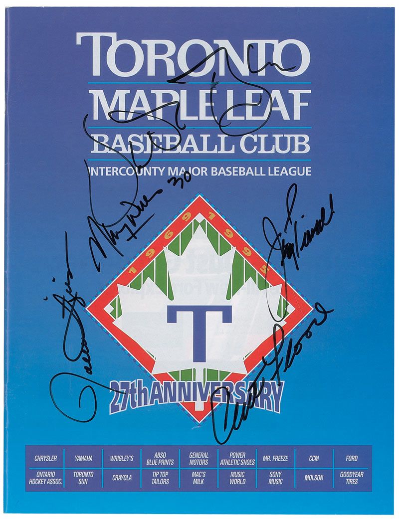 Toronto Maple Leaf Baseball Club program, 8.5 x 11, signed on the cover in black felt tip by Rollie Fingers, Curt Flood, Vida Blue, Maury Wills, and Jimmy Piersall, all of whom are featured inside as Hall of Fame inductees. In fine condition, with light handling wear and a crease to top right corner of cover.