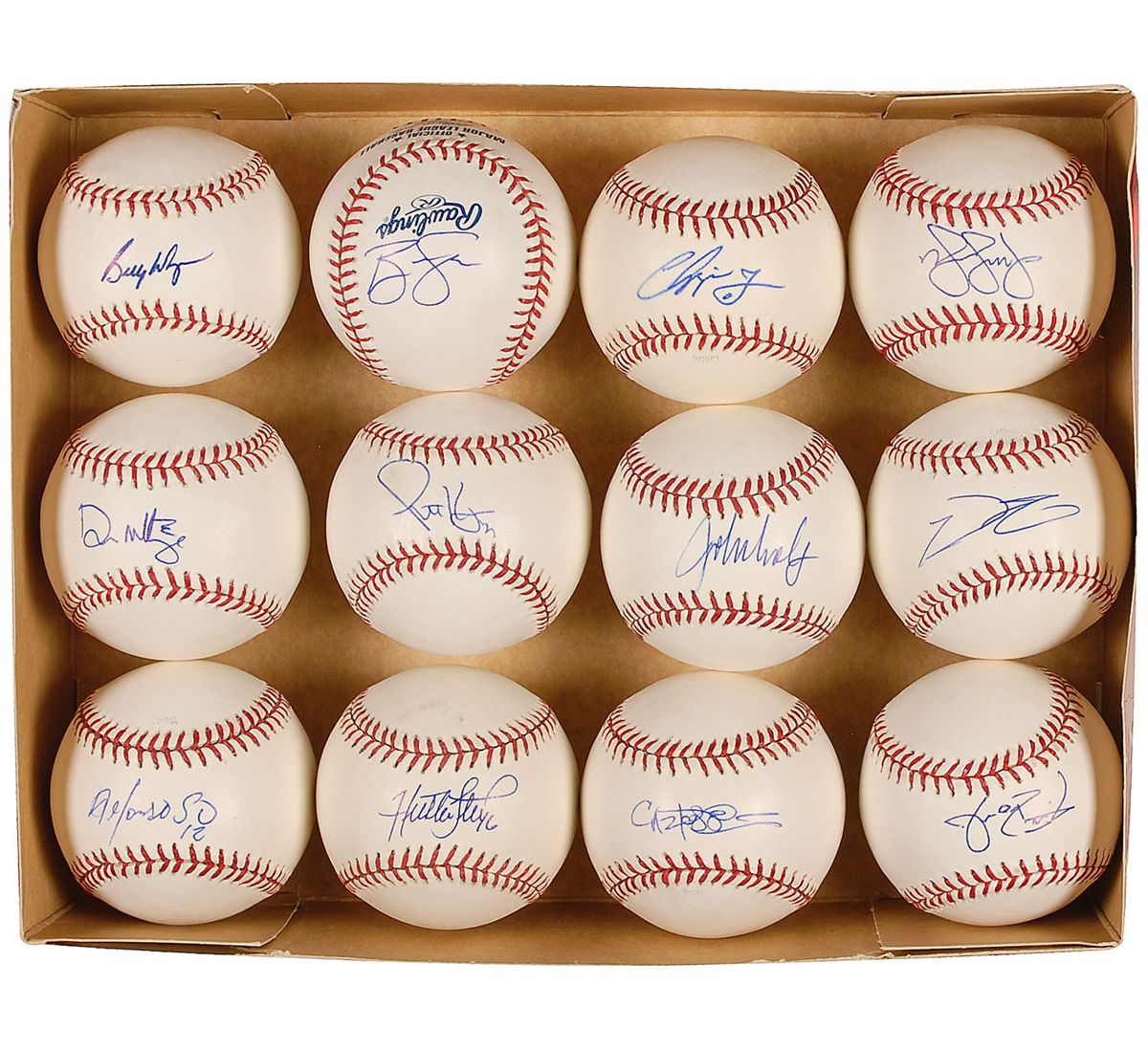 Twelve official Rawlings Major League baseballs, each signed on the sweet spot by a different player, with 11 signing in ballpoint and one signing in blue felt tip. Signers are: Billy Wagner, Don Mattingly, Alfonso Soriano, Ryan Zimmerman, Scott Kazmir, Huston Street, Prince Fielder, Chipper Jones (felt tip), John Smoltz, Omar Vizquel, Carlos Pena, and Jake Peavy. In fine condition.