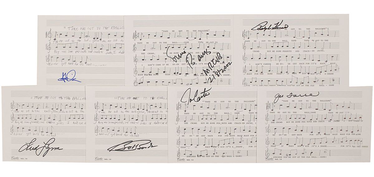 Seven souvenir musical quotes to ‘Take Me Out to the Ball Game,’ on individual 9 x 6 sheets of music paper, all written out in an unknown hand, each signed in felt tip by a different former player. Signers are: Ernie Banks, Ralph Kiner, Fred Lynn, Bobby Bonds, Joe Carter, Steve Finley, and Joe Torre. In fine condition.