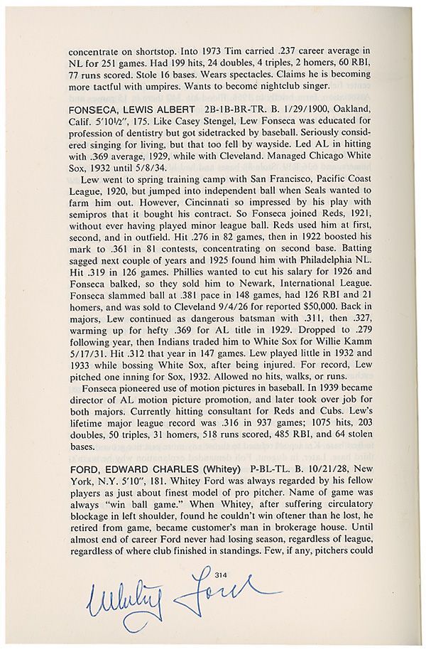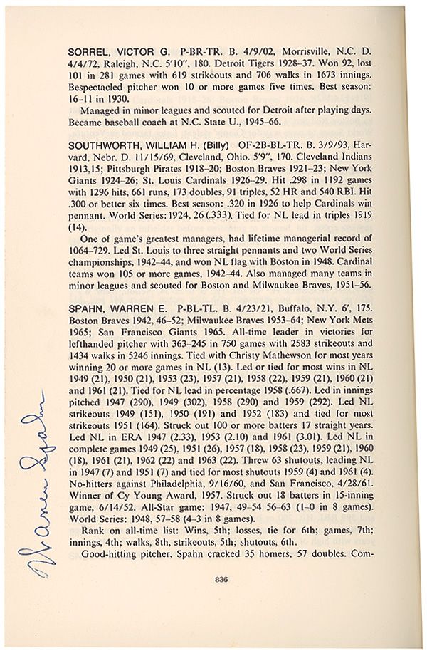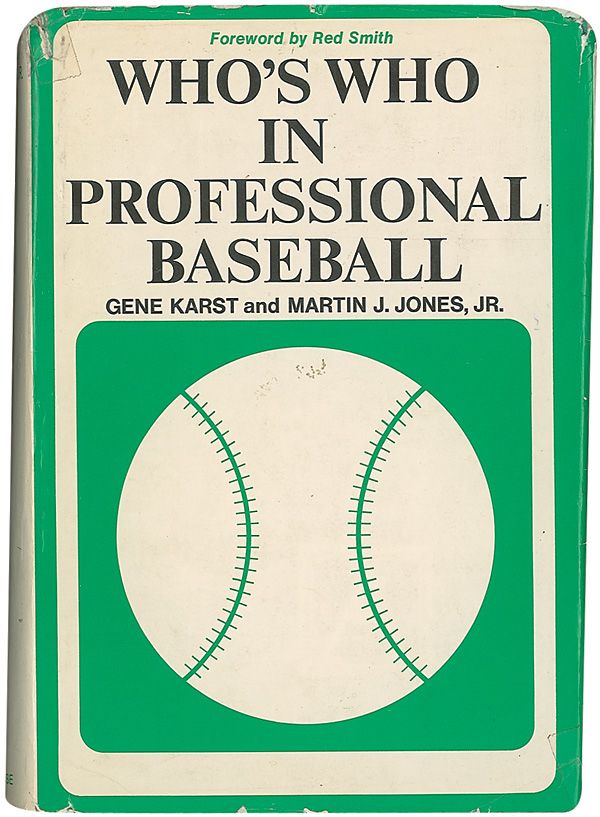 Signed book: Who’s Who in Professional Baseball. NY: Arlington House, 1973. Hardcover with dustjacket, 6.5 x 9.5, 919 pages. Signed inside by over 100 former players, including 28 Hall of Famers. Signers include: Rich Allen, Luke Appling, Rich Ashburn, Al Barlick, Lou Boudreau, Steve Carlton, Orlando Cepeda, Larry Doby, Bob Feller, Rollie Fingers, Whitey Ford, Billy Herman, Monte Irvin, Fergie Jenkins, George Kell, Ralph Kiner, Bill Mazeroski, Johnny Mize, Joe Morgan, Stan Musial, Jim Palmer, Tony Perez, Robin Roberts, Ron Santo, Red Schoendienst, Enos Slaughter, Warren Spahn, Willie Stargell, and Hoyt Wilhelm. In very good condition, with toning to free end pages and pastedowns, partially separated rear hinge, wear to boards, cracking to spine, and scattered wear and tear to dustjacket.