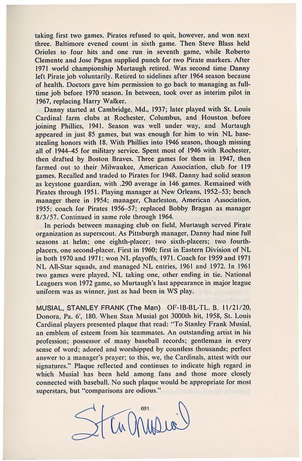 Signers are: Jack Aker, Rich Allen, Luke Appling, Richie Ashburn, Bob Avila, Al Barlick, Dick Bartell, Bobby Bonds, Hank Borowy, Lou Boudreau, Larry Bowa, Ralph Branca, Johnny Briggs, Jim Brosnan, Bill Bruton, Lew Burdette, Smoky Burgess, Johnny Callison, Jose Cardenal, Steve Carlton, Dave Cash, Orlando Cepeda, Gene Conley, Roger ‘Doc’ Cramer, Mike Cuellar, Al Dark, Larry Doby, Del Ennis, Bob Feller, Rollie Fingers, Whitey Ford, Ned Garver, Steve Garvey, Dick Groat, Billy Herman, Tom Holmes, Monte Irvin, Fergie Jenkins, Eddie Joost, George Kell, Ralph Kiner, Darold Knowles, Jim Lonborg, Ed Lopat, Garry Maddox, Art Mahaffey, Bill Mazeroski, Denny McClain, Sam McDowell, Cal McLish, Denis Menke, Johnny Mize, Don Money, Terry Moore, Joe Morgan, Stan Musial, Al Oliver, Claude Osteen, Paul Owens, Andy Pafko, Jim Palmer, Milt Pappas, Wes Parker, Tony Perez, Jim Piersall, Johnny Podres, Boog Powell, Ken Raffensberger, Pedro Ramos, Ron Reed, Robin Roberts, Cookie Rojas, Johnny Sain, Ron Santo, Hank Sauer, Eddie Sawyer, Carl Scheib, Red Schoendienst, Barney Schultz, Herb Score, Andy Seminick, Bobby Shantz, Chris Short, Roy Sievers, Curt Simmons, Enos Slaughter, Warren Spahn, Willie Stargell, Frank Thomas, Lee Thomas, Bobby Thomson, Bob Tolan, Del Unser, Elmer Valo, Mickey Vernon, Harry Walker, Roy White, Hoyt Wilhelm, Bobby Wine, Rick Wise, and Gus Zernial.