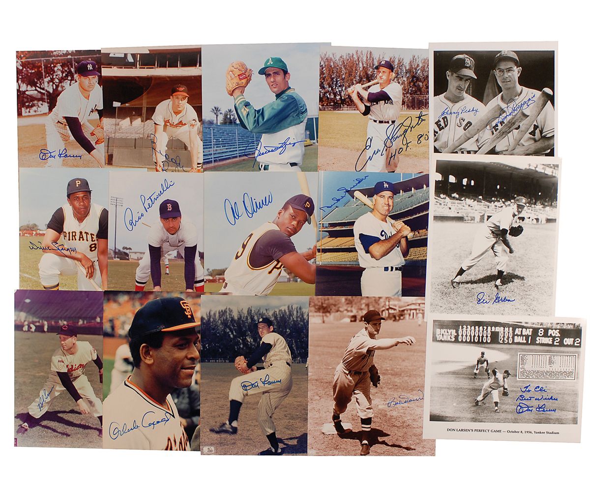 Fifteen glossy 8 x 10 photos, 11 color, each signed by the respective player pictured. Signers are: Willie Stargell, Duke Snider, Bob Lemon, Orlando Cepeda, Dom DiMaggio & Johnny Pesky, Brooks Robinson, Enos Slaughter, Rollie Fingers, Bobby Doerr, Don Larsen (3), Al Oliver, Rico Petrocelli, and Eli Grba. In overall fine condition, with corner tip dings to a few of the photos.