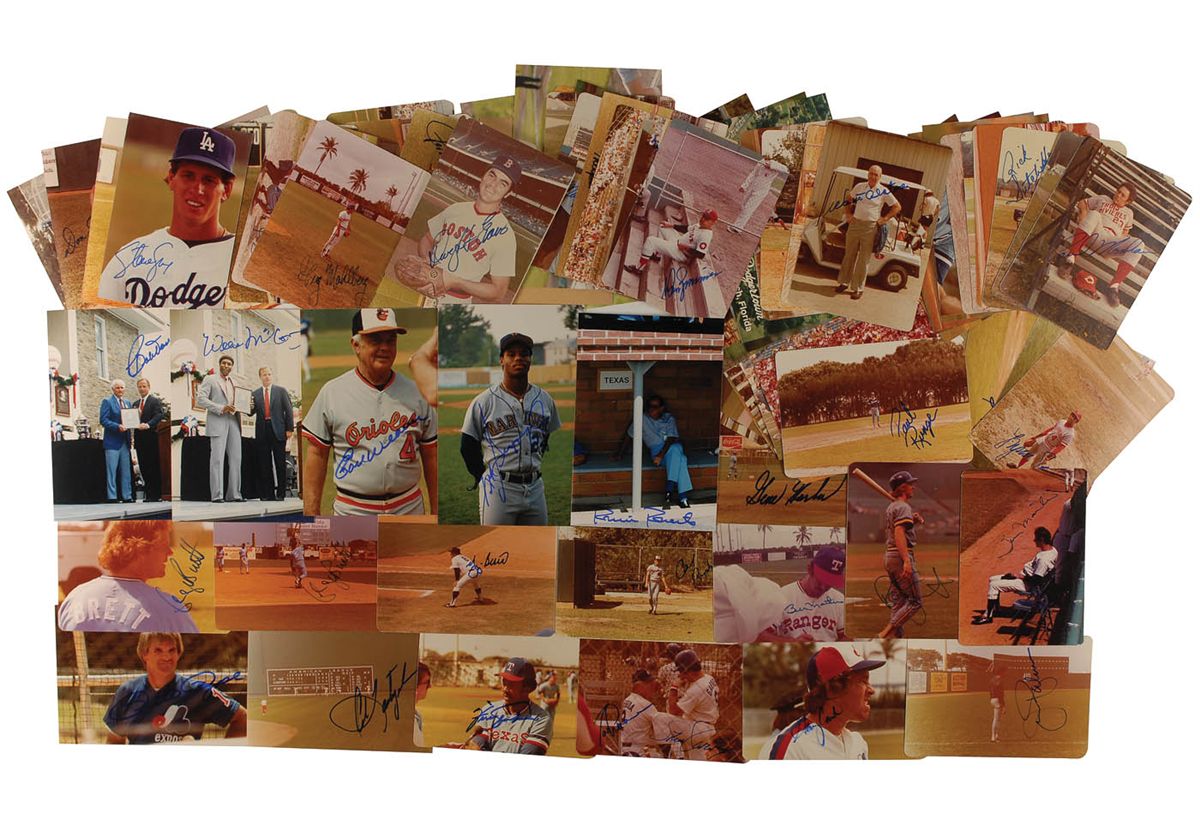 Enormous collection of over 210 color photos of various finishes, ranging from 3 x 5 to 4 x 6, consisting of never-before-seen candid snapshots of numerous ballplayers, each signed by the player pictured. Many of the pictures appear to have been taken at spring training and Fenway Park. Signers include: Billy Martin (2), Carl Yastrzemski, George Brett (2), Robin Yount, Cal Ripken, Jr., Yogi Berra, Whitey Ford, Ken Griffey, Jr., Pete Rose, Robin Roberts, Willie McCovey, Fergie Jenkins (3), Earl Weaver, Bobby Doerr, Tommy Lasorda, Deion Sanders, Dale Murphy, Bernie Williams (3), Jim Palmer, Walter Alston, Johnny Sain, Carl Erskine, Mark Grace, Joe Torre, Jeff Bagwell, Dave Righetti, Dock Ellis, Dwight Evans (2), Steve Garvey, Gary Carter, Bob Watson, Buddy Bell, Mickey Rivers, Joe Girardi, Jerry Koosman, Bob Horner, Jeff Torborg, Bert Campaneris, Rick Burleson, Tommy Aaron, Billy Bean, Tony Cloninger, Mike Mussina, Steve Balboni, Steve Sax, Clint Hurdle, Jim Leyritz, Danny Ozark, Don Zimmer, Reggie Smith, Chris Chambliss, Mel Stottlemeyer, Willie Upshaw, Danny Ainge, Pedro Guerrero, Bruce Froemming, Vada Pinson, Bobby Murcer, Amos Otis, and Al Campanis. In overall fine condition.