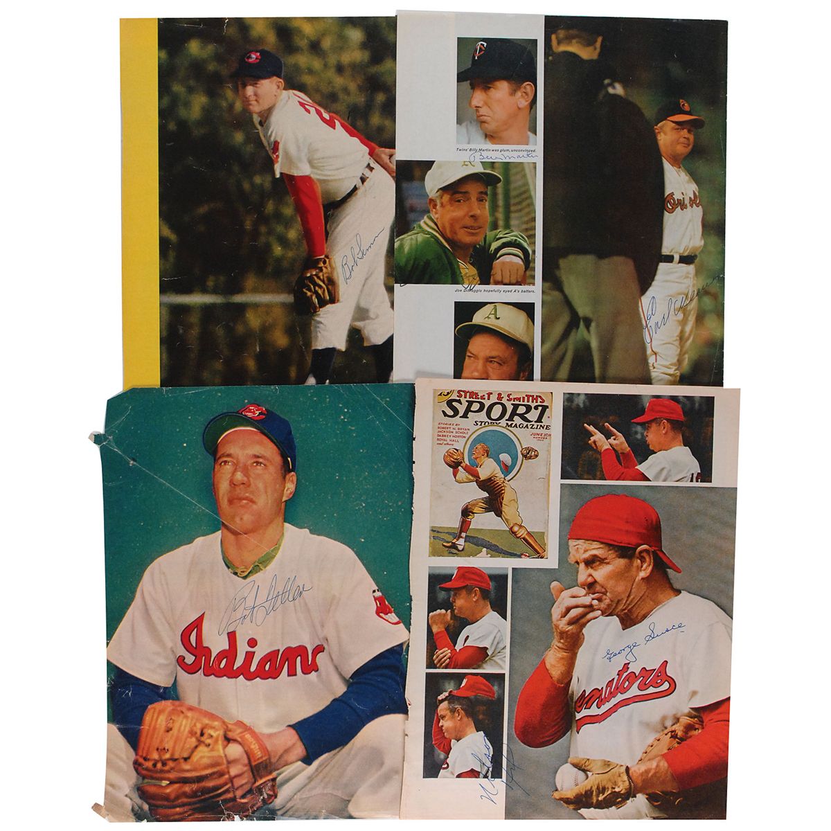 Four color magazine photos, each approximately 8.25 x 11, signed in felt tip or ballpoint by one or more of the players pictured. Signers are: Joe DiMaggio, Billy Martin, and Early Wynn; Nellie Fox and George Susce (signed on reverse by Ted Kluszewski); Bob Feller; and Bob Lemon. In overall very good to fine condition, with various scattered creases and poor contrast to DiMaggio’s signature.