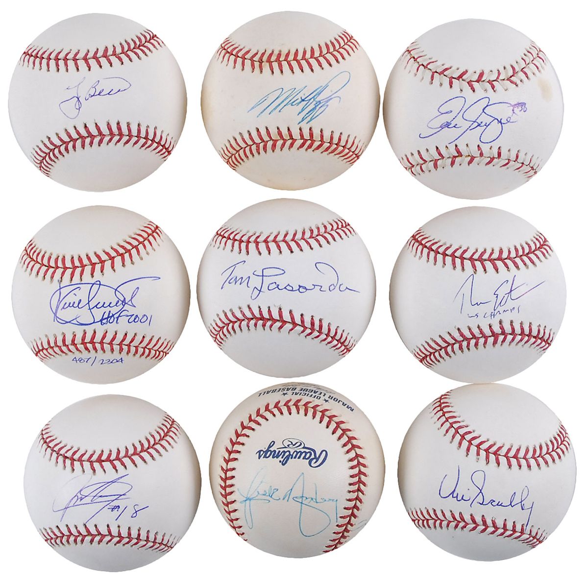 Collection of nine official Rawlings baseballs, each signed in ballpoint on the sweet spot or side panel by a different player, announcer, or executive. Signers are: Yogi Berra, Kirby Puckett, Vin Scully (2; one also signed by Ross Porter and Rick Monday), Mike Piazza, Eric Gagne, Tommy Lasorda, Theo Epstein, and one other. In fine condition.