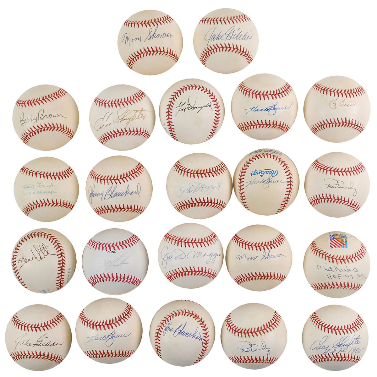 Nice collection of 22 baseballs, each signed in ballpoint by a noteworthy player, including: Joe DiMaggio, Whitey Ford, Yogi Berra, Enos Slaughter (2), Hank Bauer (3), Johnny Blanchard (2), Bobby Brown, Jake Gibbs (2), Dwight Gooden, Ron Guidry (2), Gil McDougald, Phil Neikro, Mickey Rivers and Elliott Maddox, Phil Rizzuto, and Bill ‘Moose’ Skowron (2). All but the Gooden are official Rawlings American or National League baseballs. Scattered toning and soiling, otherwise overall fine condition; the DiMaggio is in fine to very fine bright white condition.