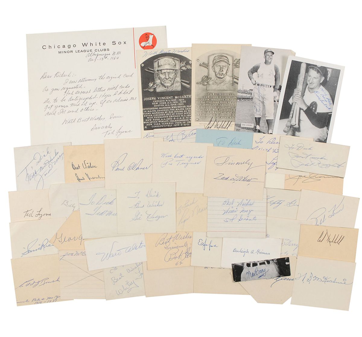 Fantastic collection of 48 signatures of baseball players on various slips and cards, some inscribed, with highlights including Joe DiMaggio, Gil Hodges, Roger Maris, Willie Mays (very early), Pie Traynor, Paul Waner, Zack Wheat, and Ted Williams. Additional signers are: Walter Alston, Luke Appling (SP and signature), Yogi Berra, Max Carey, Orlando Cepeda, Joe Cronin, Urban ‘Red’ Faber, Bob Feller, Whitey Ford, Frank Frisch, Charles Gehringer, Lefty Gomez, Hank Greenberg, Burleigh Grimes, Lefty Grove, Gabby Hartnett, Billy Herman, Elston Howard, Carl Hubbell (HOF card and signature), Ralph Kiner, Ernie Lombardi (SP and signature), Ted Lyons (ALS and signature), Heinie Manush, Joe McCarthy (HOF card and signature), Bill McKechnie, Sam Rice, Eppa Rixey, Phil Rizzuto, Edd Roush, Ray Schalk (ANS), George Sisler, Bill ‘Moose’ Skowron, Duke Snider, Bill Terry, and Bobby Thomson. In overall fine condition.