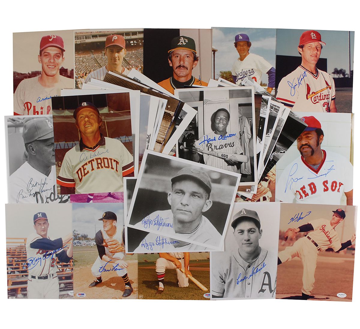 Impressive collection of 35 photos, 8 x 10 and 10 x 8, each signed in ink by the baseball player pictured, including: Hank Aaron, Willie McCovey, Billy Herman, Dom DiMaggio, Riggs Stephenson (2), Charlie Grimm, Brooks Robinson, Fergie Jenkins, Frank Robinson, Al Kaline, Bob Doerr, Joe Sewell, Luke Appling, Bob Lemon, Billy Martin, Barney McCosky, Bill Nicholson, Hank Bauer, Mel Harder, Vinegar Bend Mizell, Herb Score, Carl Scheib, Norm Larker, Vern Law, Johnny Logan, Luis Tiant, Bobby Shantz, Dick Allen, Lew Burdette, Bill ‘Moose’ Skowron, Jim Kaat, Maury Wills, and two others. In overall very good to fine condition, with scattered creases to the Aaron photo. Several photos are accompanied by certificates of authenticity from PSA/DNA.
