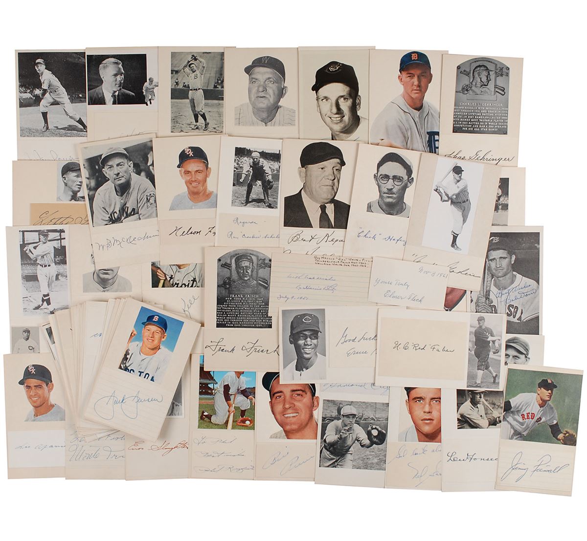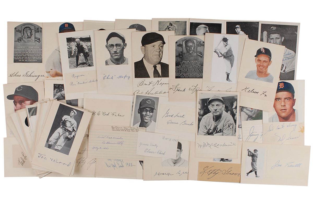 Fantastic collection of over seventy signatures from baseball players of all eras, most on small cards or slips affixed to larger 3.5 x 6 cards bearing affixed images of the signers, plus a couple signed photos, including: Richie Ashburn, Ernie Banks, U. C. ‘Red’ Faber, Elmer Flick, Nelson Fox, Frank Frisch, Charles Gehringer, Lefty Gomez, Goose Goslin, Burleigh Grimes, Lefty Grove, Chick Hafey, Waite Hoyt, Cal Hubbard, Carl Hubbell, Al Kaline, Ralph Kiner (SP), Ted Lyons, Heinie Manush, Bill McKechnie, Hal Newhouser, Sam Rice, Eppa Rixey, Phil Rizzuto, Ray Schalk, Mike Schmidt, George Sisler, Doc White, and more than forty others. In overall fine condition.