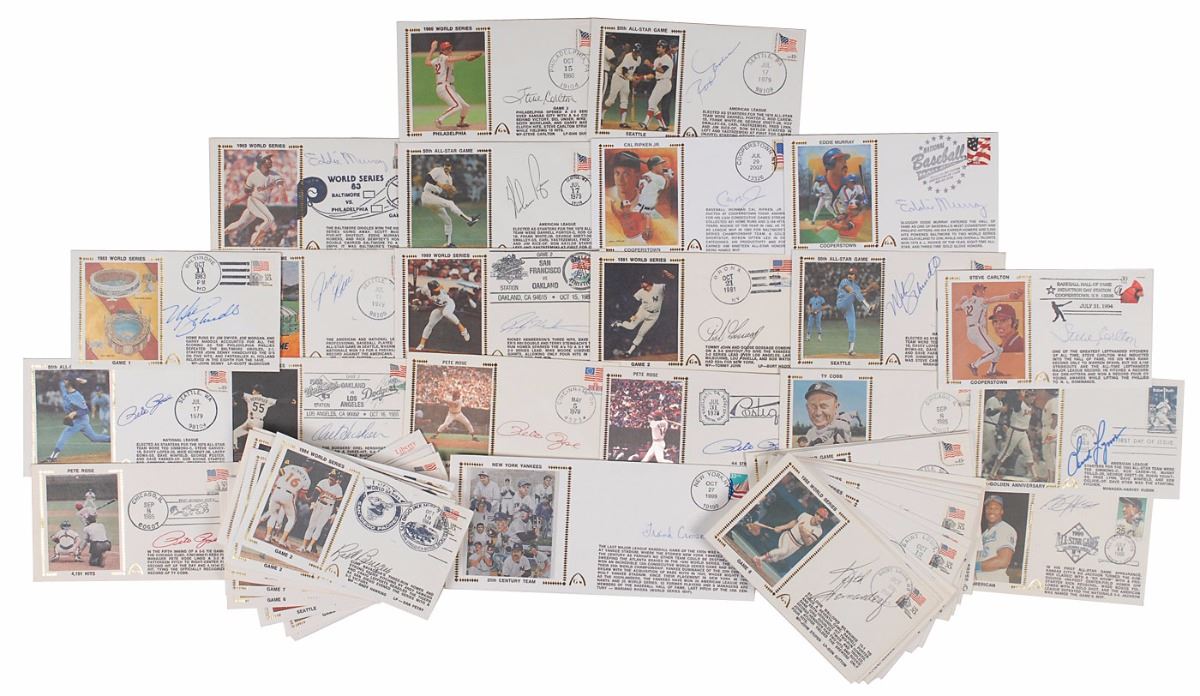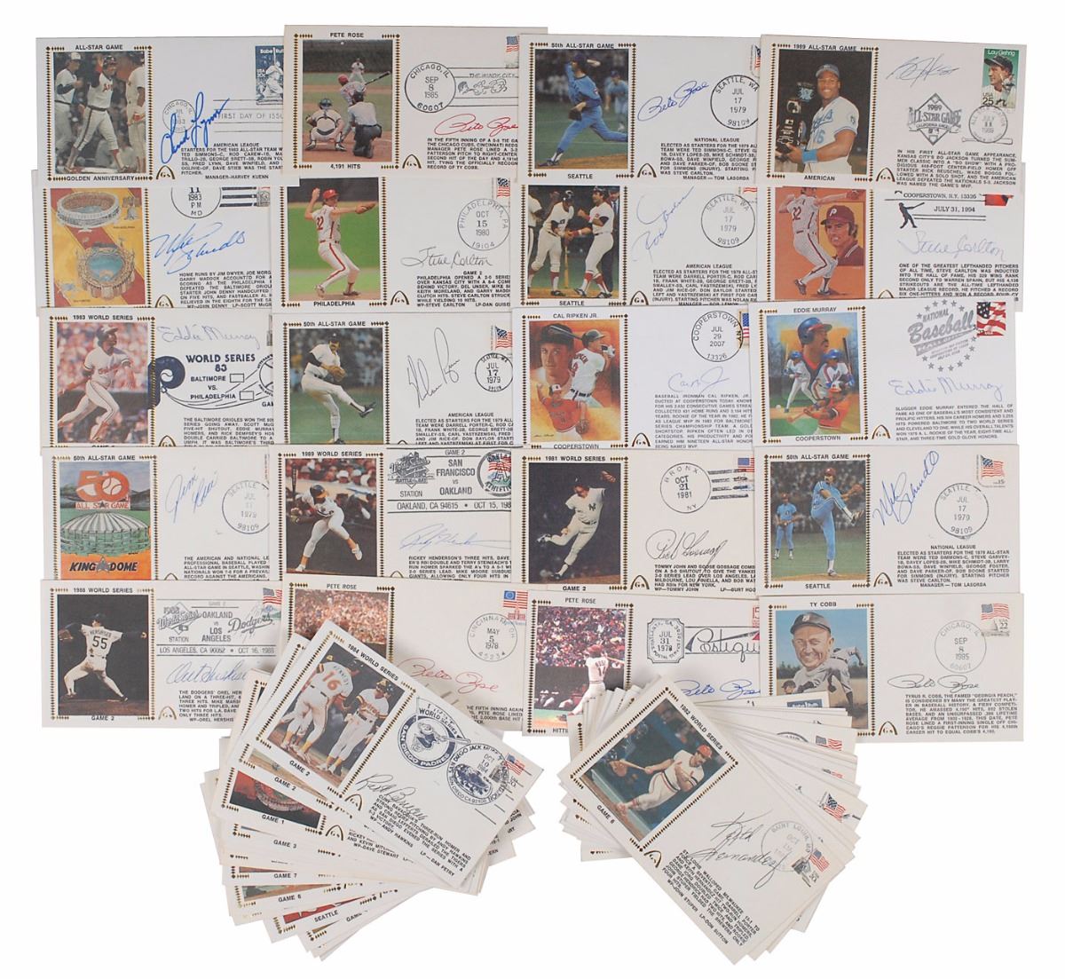 Collection of sixty Gateway covers with silk cachets honoring a variety of players and events, each signed in ballpoint or felt tip by a notable baseball player, including: Rod Carew, Steve Carlton (2), Goose Gossage, Rickey Henderson, Orel Hershiser, Bo Jackson, Fred Lynn, Eddie Murray (2), Jim Rice, Cal Ripken, Jr., Pete Rose (5), Nolan Ryan, Mike Schmidt (2), Joaquin Andujar, Mike Caldwell, Jose Canseco, Ron Cey, Larry Christenson, Frank Crosetti, John Denny, Lenny Dykstra, Steve Garvey, Kirk Gibson, Dwight Gooden, Mudcat Grant, Mickey Hatcher (2), Keith Hernandez, Willie Hernandez, Bruce Hurst, Wally Joyner, Ron Kittle, Ray Knight, Lee Mazzilli, Graig Nettles, Jerry Reuss, Jose Rijo, Jim Slaton, Dave Stieb, John Tudor, Frank Viola, Matt Williams (2), Willie Wilson, and nine others. In overall fine condition, with haloing to a few of the signatures.