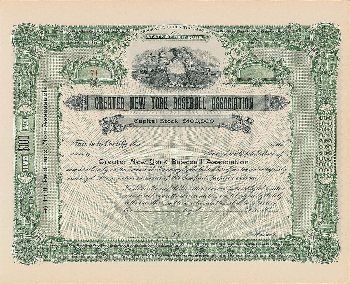 Uncommon DS, one page, 11.5 x 9.25, no date but circa early 1900’s. Unissued Greater New York Baseball Association capitol stock certificate. In fine condition.