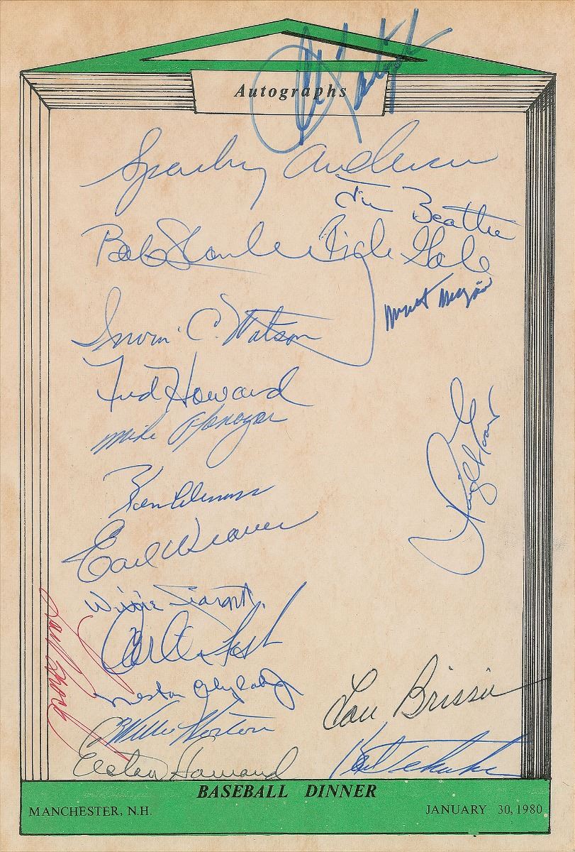 Ink signatures of baseball figures on the reverse of a 7.5 x 11 program card for the Manchester Baseball Dinner on January 30, 1980, including: Carl Yastrzemski, Willie Stargell, Carlton Fisk, Lou Brock, Earl Weaver, Sparky Anderson, Nestor Chylak, Elston Howard, Dwight Evans, Rich Gale, Bob Stanley, Jim Beattie, Kent Tekulve, Lou Brissi, and Willie Horton. In very good to fine condition, with light overall soiling.