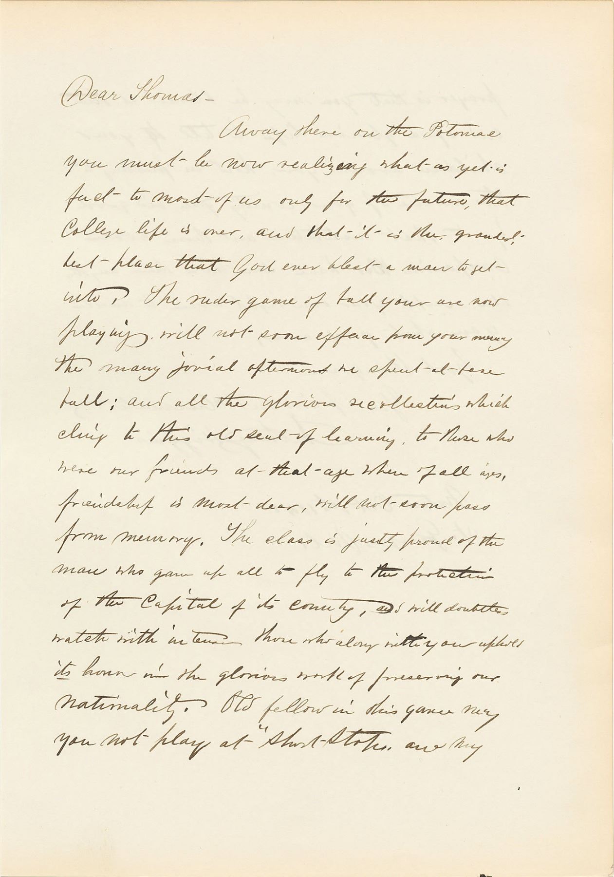 ALS signed “Anthony Higgins,” one page both sides, 8 x 11.5, no year. Written from St. Georges, Delaware, a letter to his classmate Thomas, in full: "Away there on the Potomac you must be now realizing what as yet is fact to most of us only for the future, that College life is over. and that it is the grandest, best place that God ever blest a man to get into. The ruder game of ball you are now playing will not soon efface from your memory the many jovial afternoons we spent at base ball; and all the glorious recollections which cling to this old seat of learning, to those who were our friends at that age when of all ages, friendship is most dear, will not soon pass from memory. The class is justly proud of the man who gave up all to fly to the protection of the Capital of its country, and will doubtless watch with interest those who along with you uphold its honor in the glorious work of preserving our nationality. Old fellow in this game may you not play at 'short -stop' and my prayer is that you may be blessed at the end of a glorious life to tell your children around you, how in rushing to the rescue of your country you bid good bye to that institution and those noble companions who have done more than anything else, except your own right arm to make you what you are. God bless you." In fine condition. Accompanied by an engraving of Higgins (1840–1912), a graduate of Yale University in 1861 who served in the summer of 1864 in Company B of the 7th Delaware militia, protecting railroads around Washington and Baltimore from Confederate raiders.