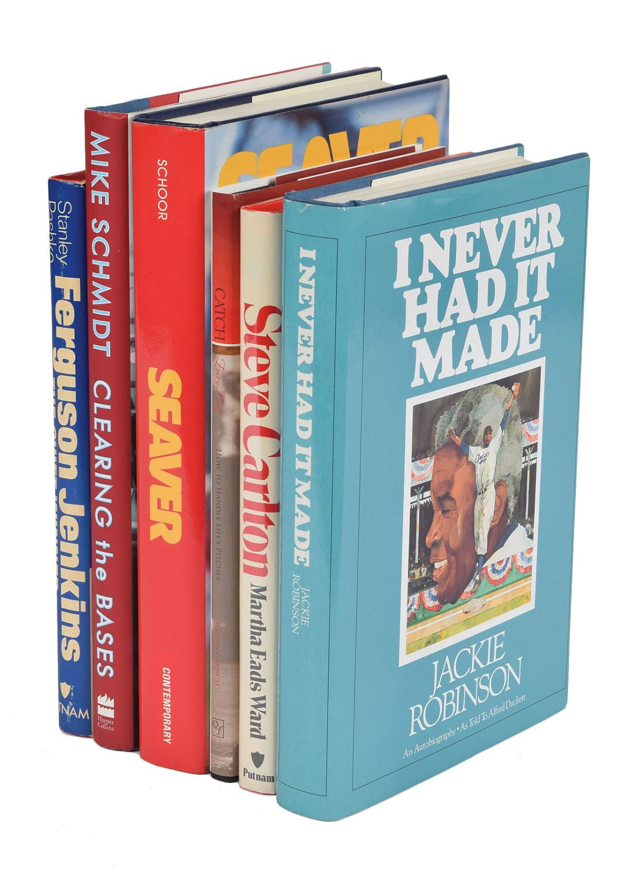 Five first edition baseball books, all hardcovers with dust jackets, each signed inside by the respective subject: Johnny Bench, Steve Carlton, Ferguson Jenkins, Mike Schmidt, and Tom Seaver. Also includes a copy of the Jackie Robinson autobiography I Never Had It Made, which is signed inside by Jackie's widow, Rachel Robinson. In overall fine condition.