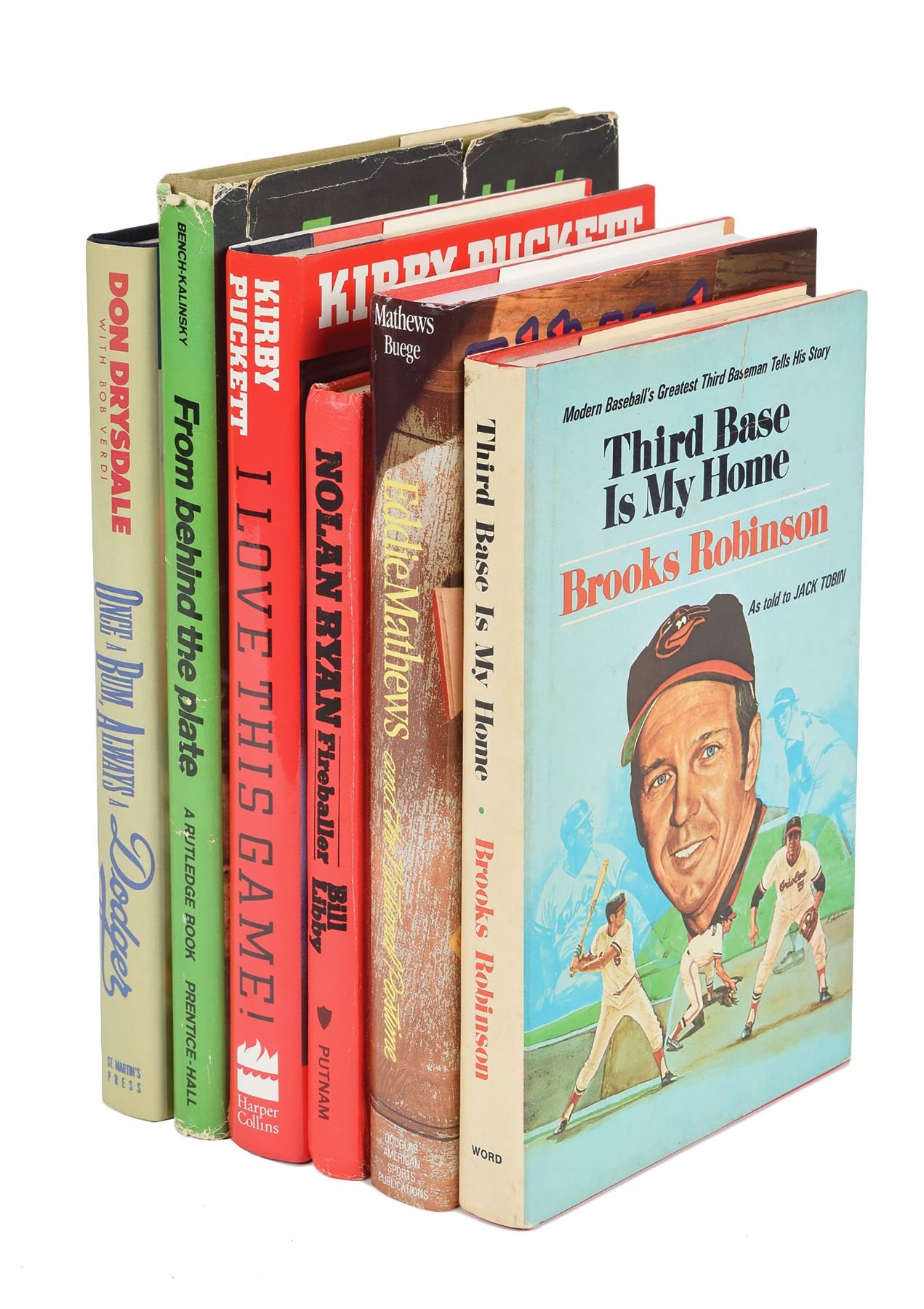 Group of six hardcover baseball books, each signed inside in ink by the Hall of Fame subject, including: Don Drysdale, Nolan Ryan, Brooks Robinson, Eddie Mathews, Kirby Puckett, and Johnny Bench. All have dust jackets except Nolan Ryan: Fireballer. In overall very good to fine condition, with tears and creasing to the Bench dust jacket, and ex-library markings to the Ryan book.