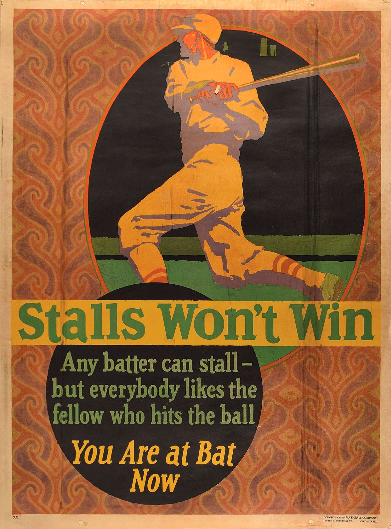 Original circa 1927 color 36 x 48 motivational poster featuring a ballplayer at bat, with a large slogan, "Stalls Won't Win," with text below reading: "Any batter can stall—but everybody likes the fellow who hits the ball, You are at bat now." Published by Mather & Company of Chicago. Linen-backed, rolled and in very good condition, with some scattered surface flaking and staining.