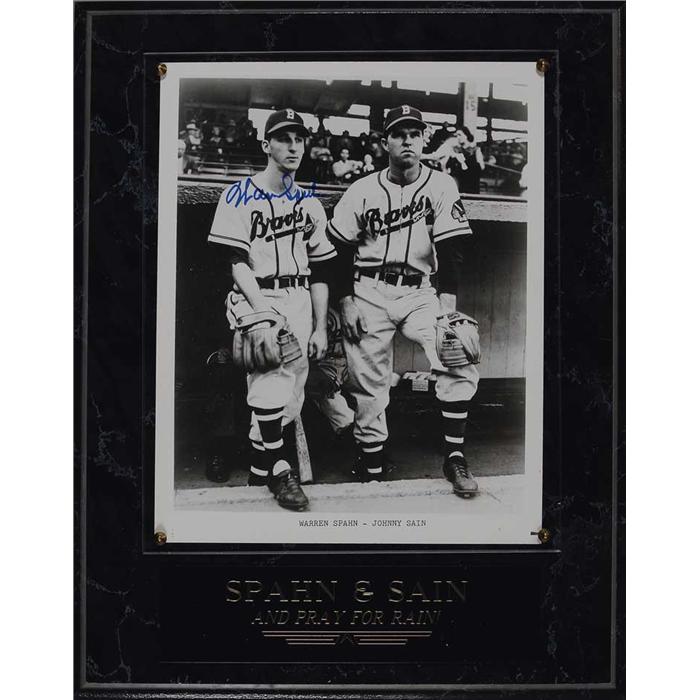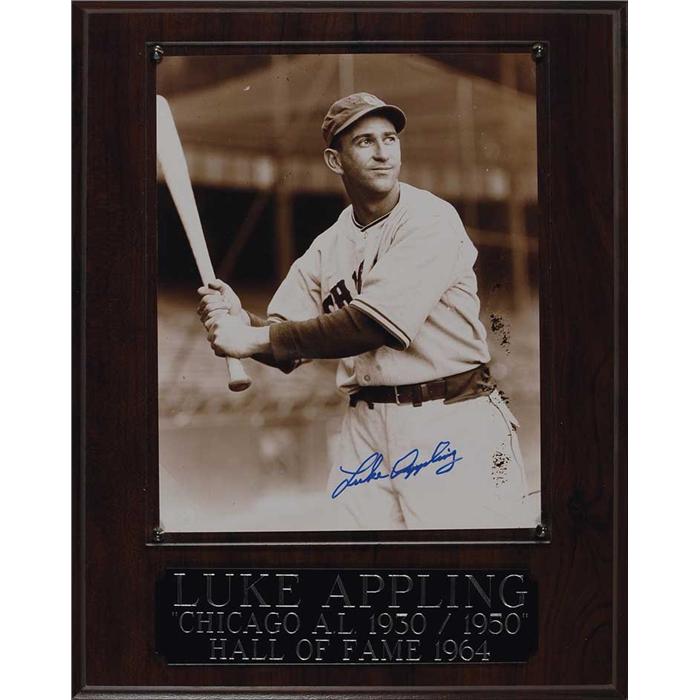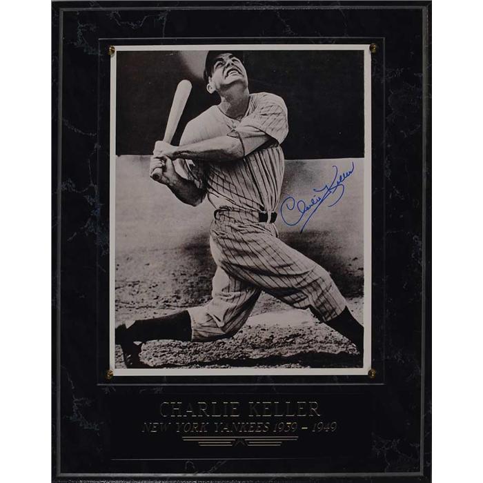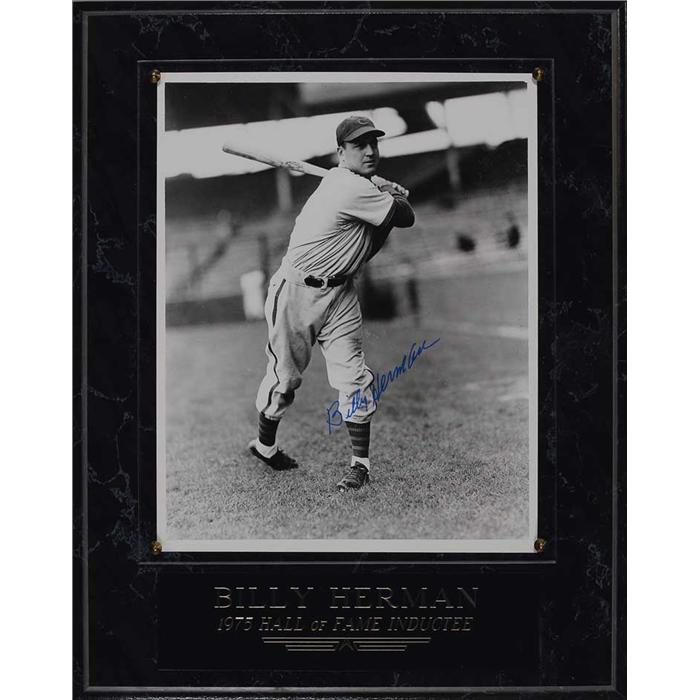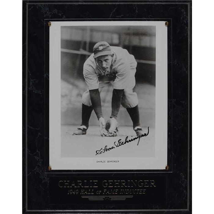 Five glossy 8 x 10 photos each signed by the respective player pictured. Signed in blue felt tip by: Luke Appling, Warren Spahn, Charlie Keller, and Billy Herman and in black felt tip by Chas Gehringer. Each photo is presented on a wooden plaque behind Lucite along with a name plaque, to an overall size of 11 x 14. In overall fine condition.