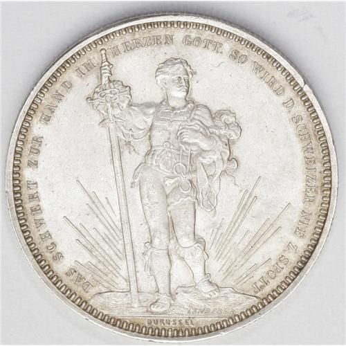 <B>Basel 5 Francs Shooting Taler 1879, </B></I>KM-S14, About Uncirculated, light gray, few marks, couple of tiny edge dings.