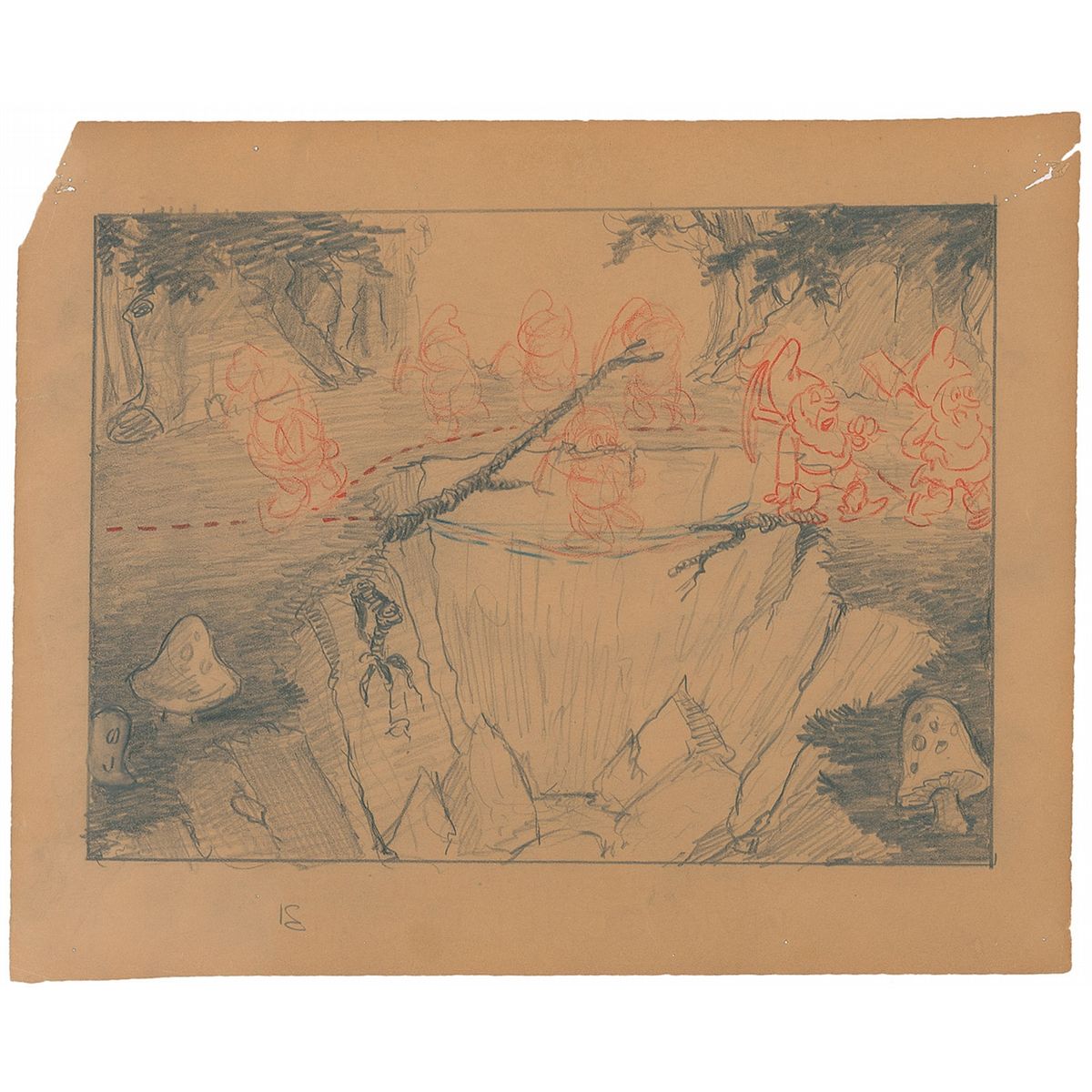 (Walt Disney Studios, 1937) Very early original concept storyboard drawing, circa 1934–35, featuring Bashful, Doc, Grumpy, Happy, Sleepy, Sneezy, and Dopey from Snow White and the Seven Dwarfs, showing them crossing a bridge while singing the famous ‘Heigh-Ho’ song while marching to work. Accomplished in graphite and colored pencil on 10.25 x 8.25 animation paper without pegholes. Image measures 8.75 x 6.25. Tack holes and small tears to corners, and paper loss to upper left corner tip, otherwise fine condition. A rare and terrific early design of one of the most memorable moments in Snow White.