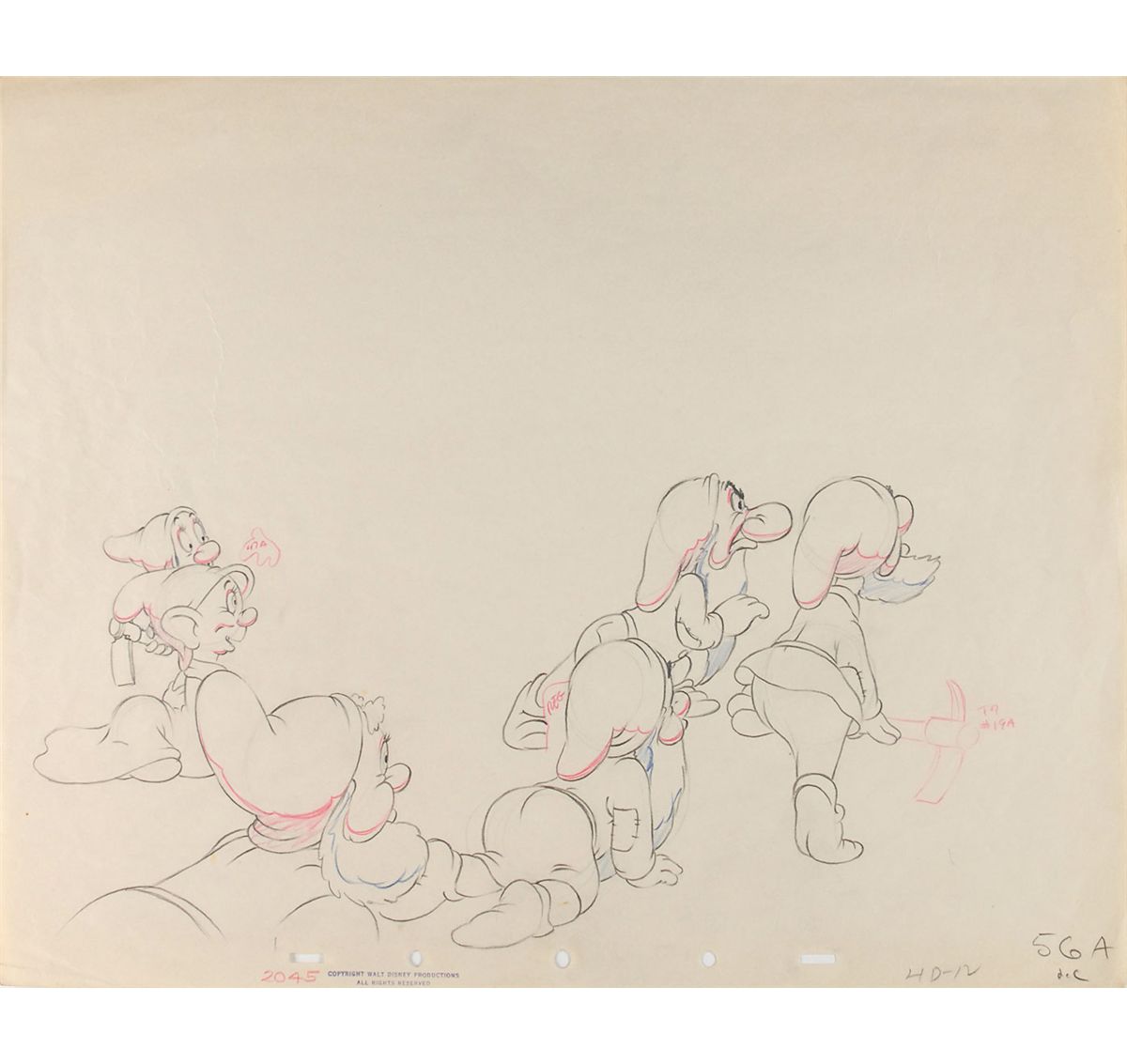 (Walt Disney Studios, 1937) Original production drawing featuring Bashful, Grumpy, Happy, Sleepy, Sneezy, and Dopey from Snow White and the Seven Dwarfs, showing the group of dwarfs in delightful detail. Accomplished in graphite and colored pencil on untrimmed 15.5 x 12.5 animation paper, which also bears Courvoisier Galleries Walt Disney Productions ink and blind stamps, and a red pencil inventory number notation. Image measures 13 x 6.5. In fine condition.